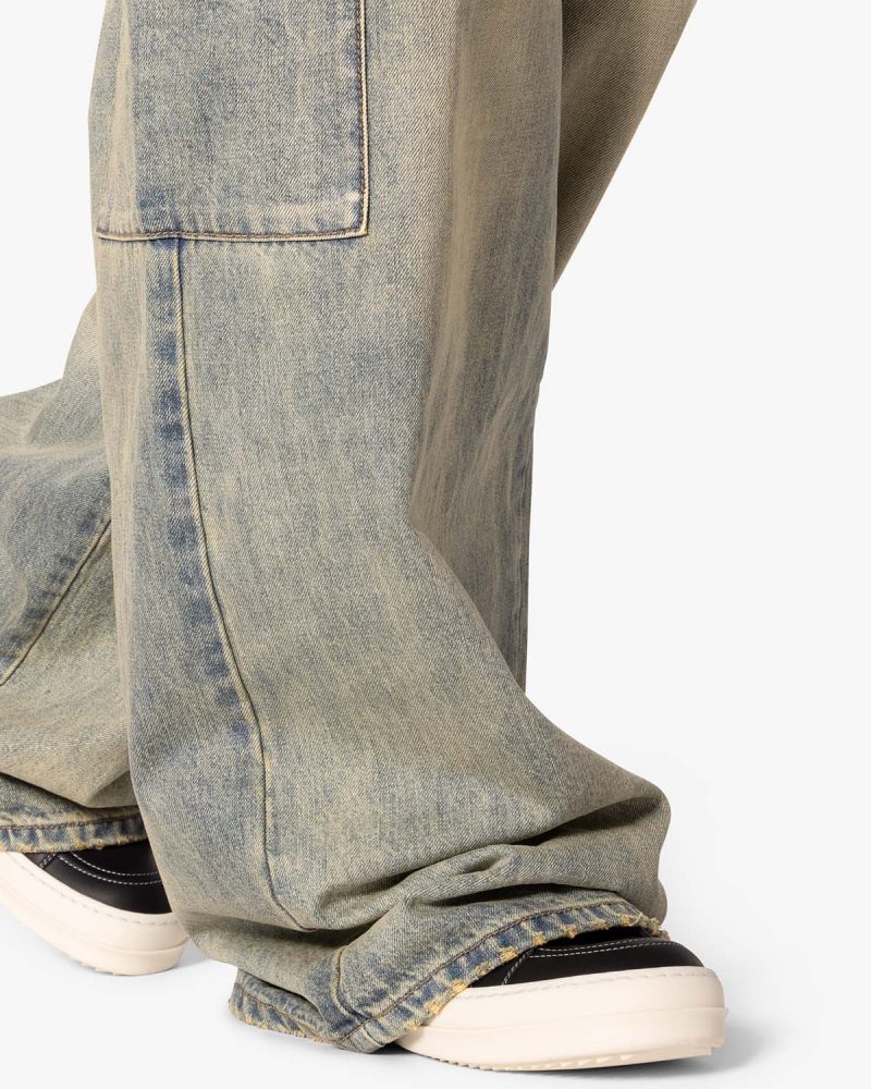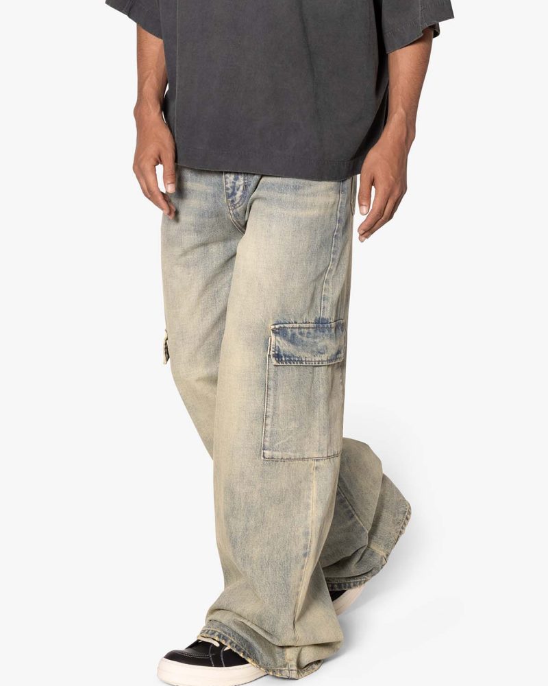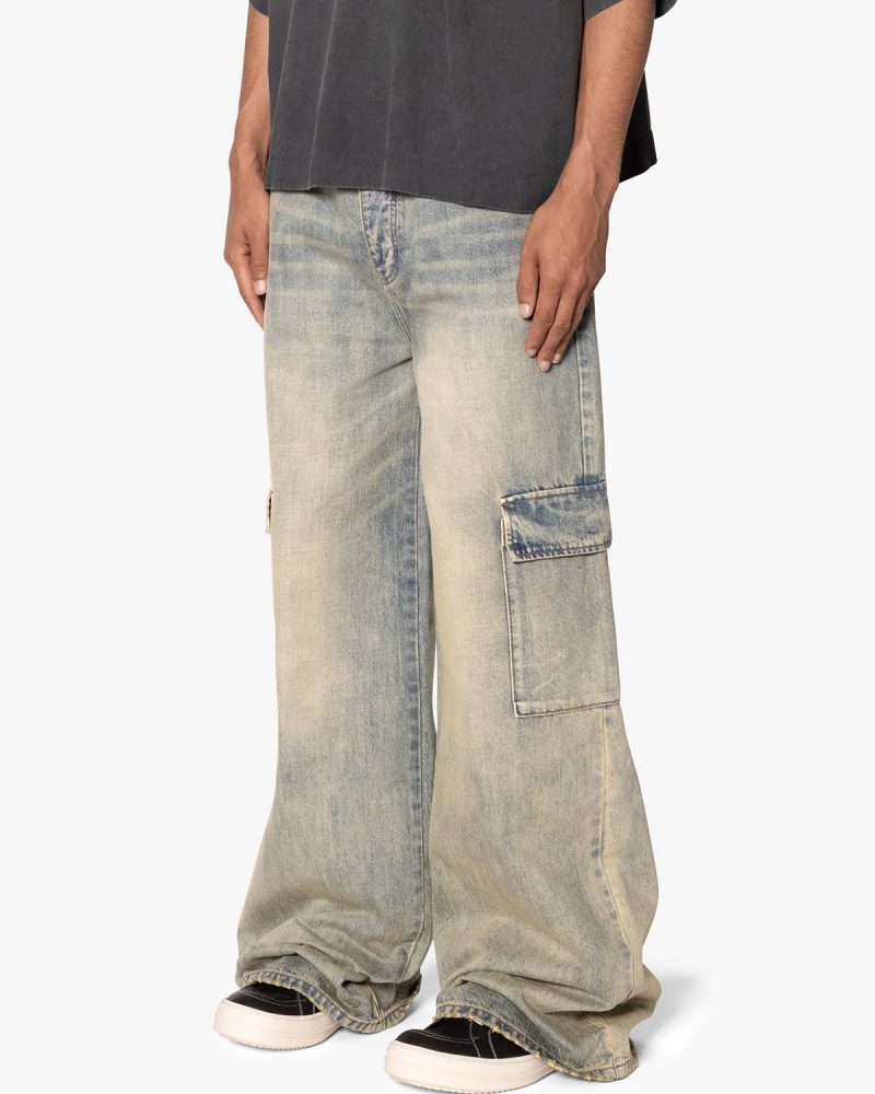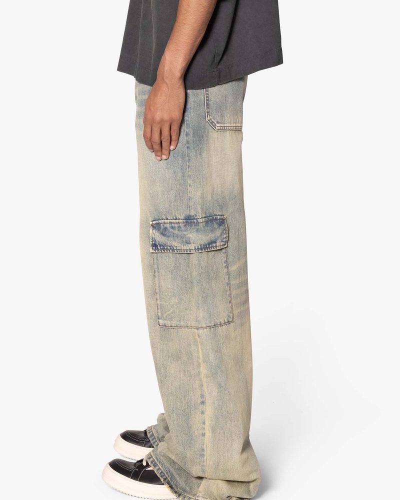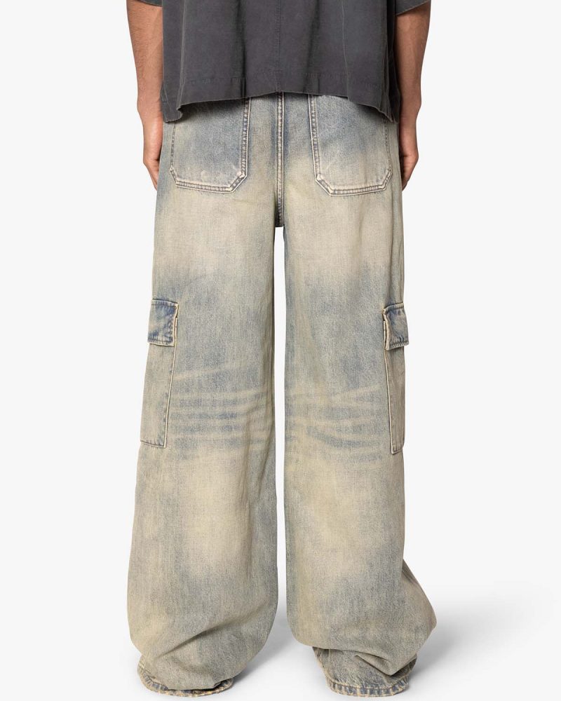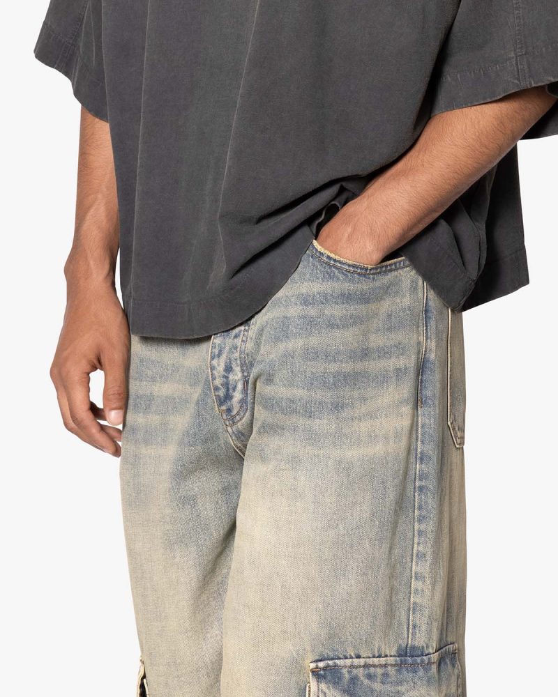 the Void Baggy Cargo Denim is a bold addition to our collection. Featuring our latest Void fit with extra room in the waist. hip. and leg opening. along with an extended inseam from our Rave Fit. Constructed from vintage washed cotton denim. embracing traditional 5 pocket denim details. and completing with oversized cargo pockets at the outseam.