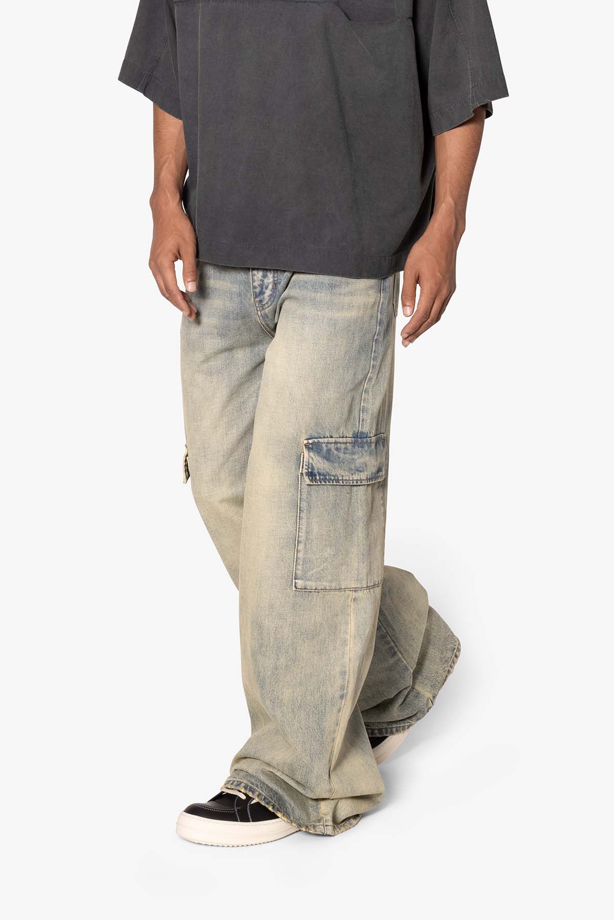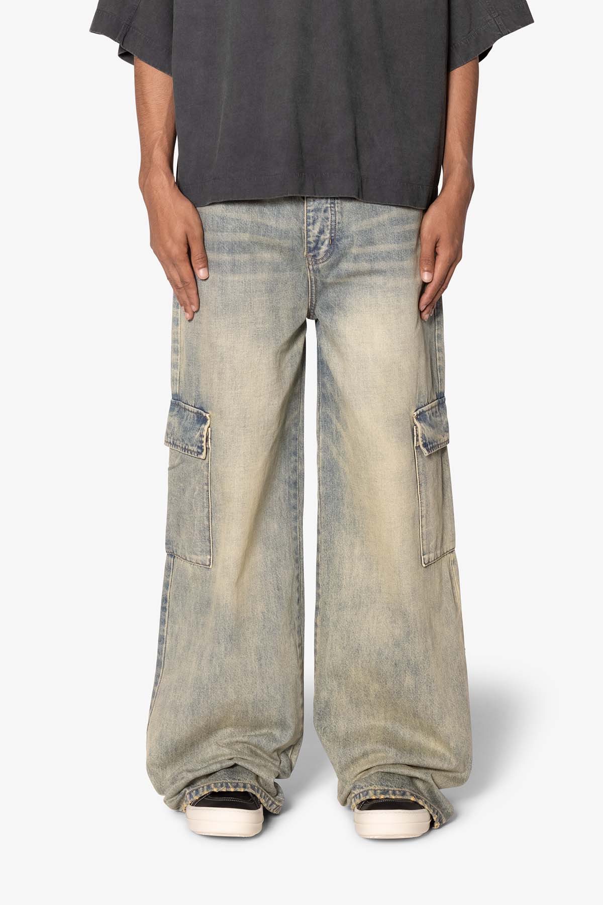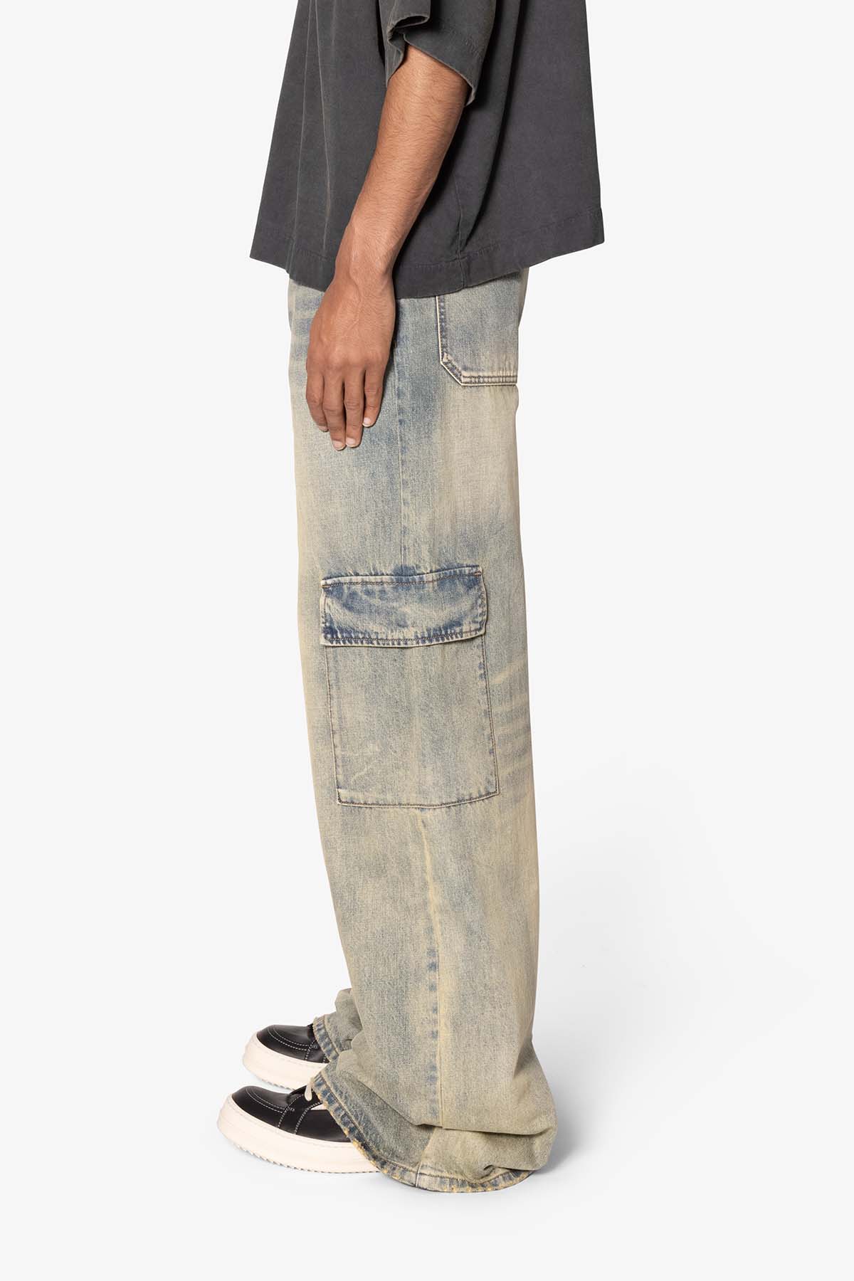 the Void Baggy Cargo Denim is a bold addition to our collection. Featuring our latest Void fit with extra room in the waist. hip. and leg opening. along with an extended inseam from our Rave Fit. Constructed from vintage washed cotton denim. embracing traditional 5 pocket denim details. and completing with oversized cargo pockets at the outseam.
