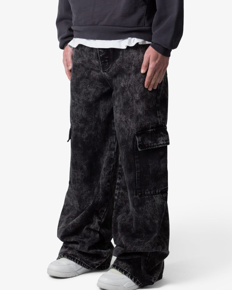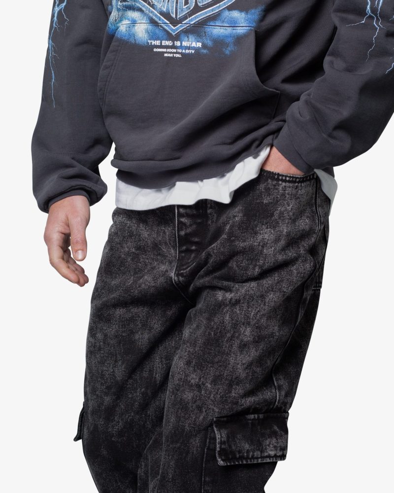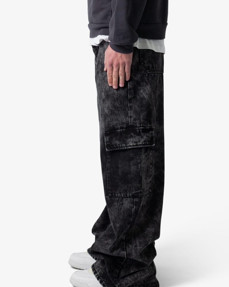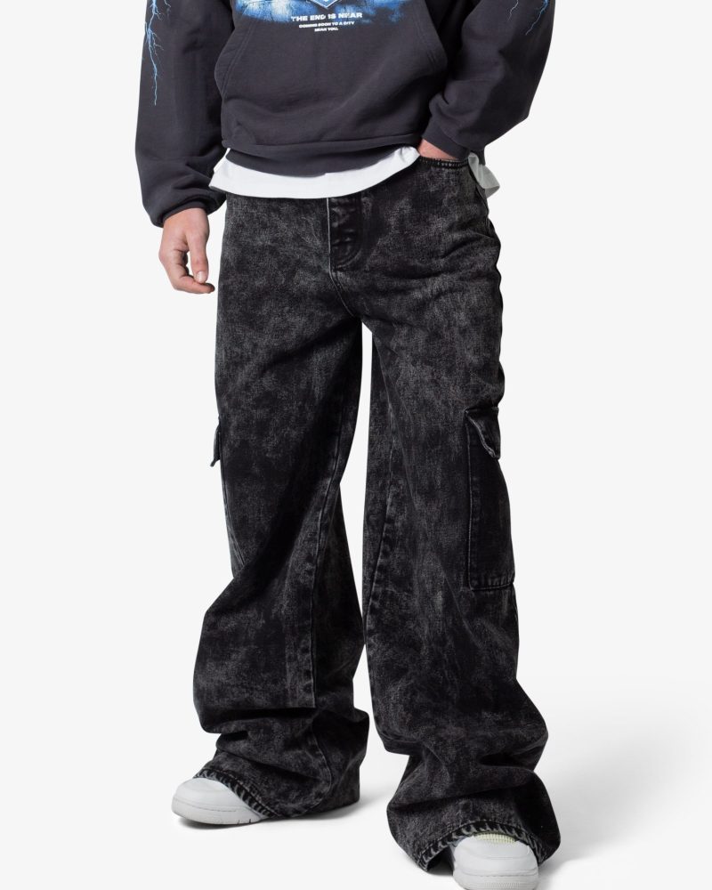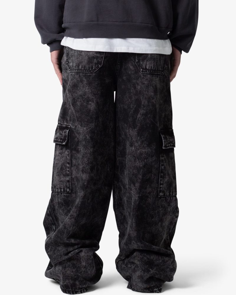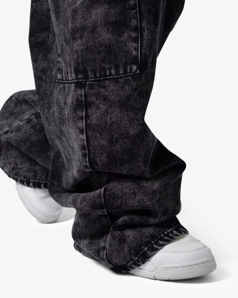 the Void Baggy Cargo Denim is a bold addition to our collection. Featuring our latest Void fit with extra room in the waist. hip. and leg opening. along with an extended inseam from our Rave Fit. Constructed from vintage washed black cotton-polyester denim. embracing traditional 5 pocket denim details. and completing with oversized cargo pockets at the outseam.