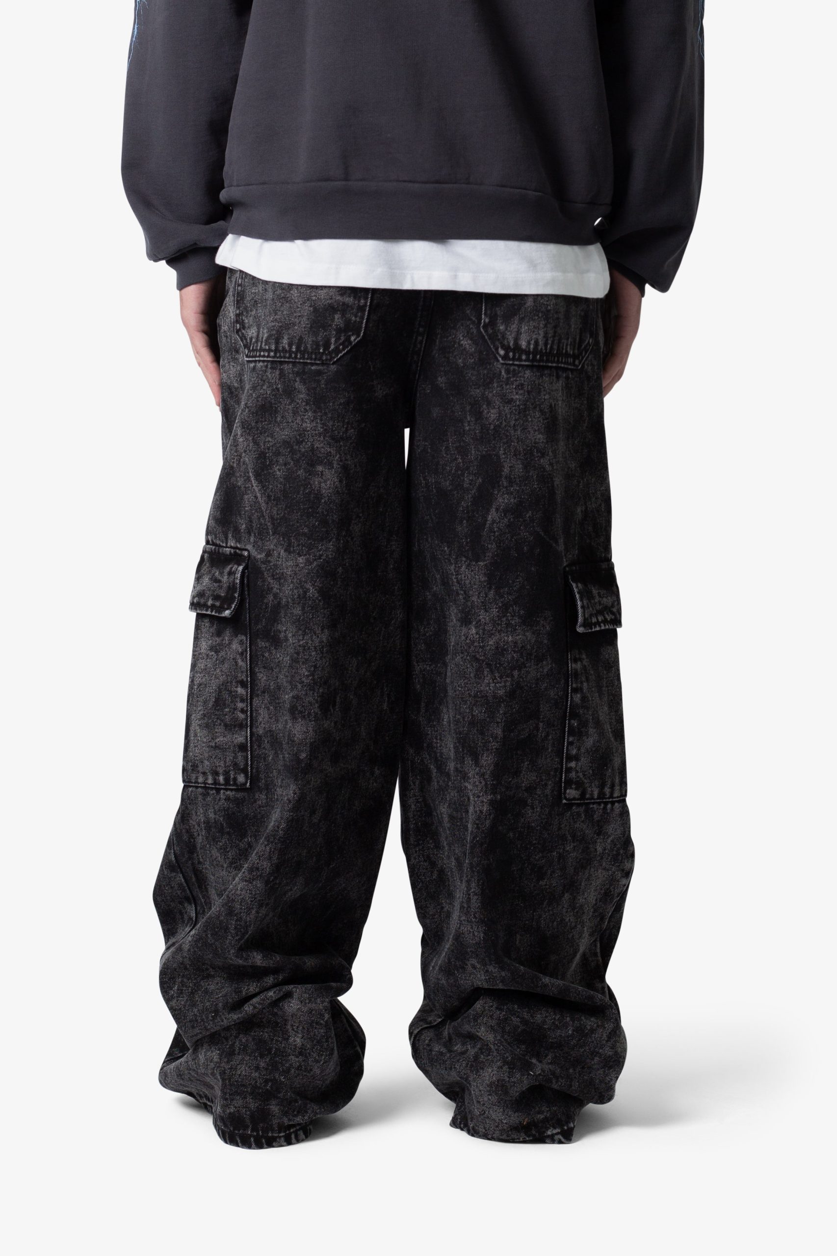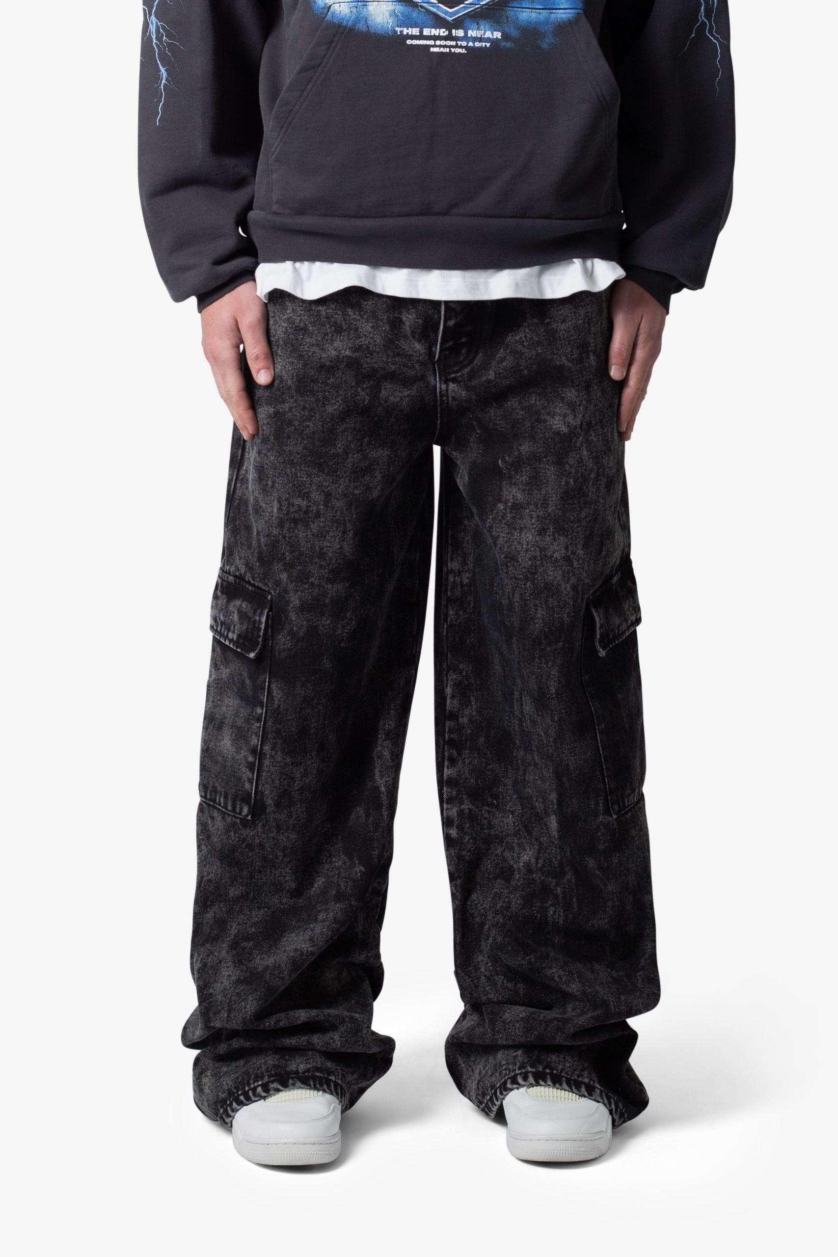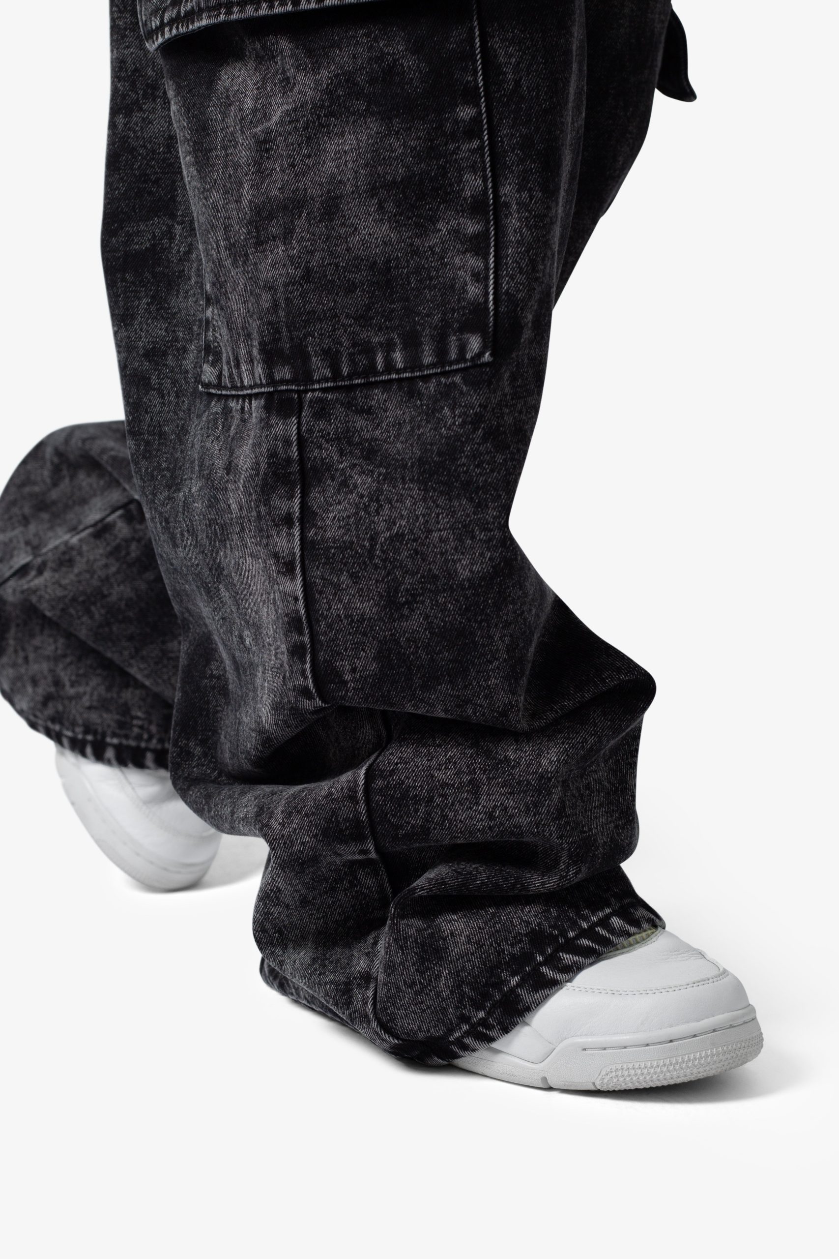 the Void Baggy Cargo Denim is a bold addition to our collection. Featuring our latest Void fit with extra room in the waist. hip. and leg opening. along with an extended inseam from our Rave Fit. Constructed from vintage washed black cotton-polyester denim. embracing traditional 5 pocket denim details. and completing with oversized cargo pockets at the outseam.