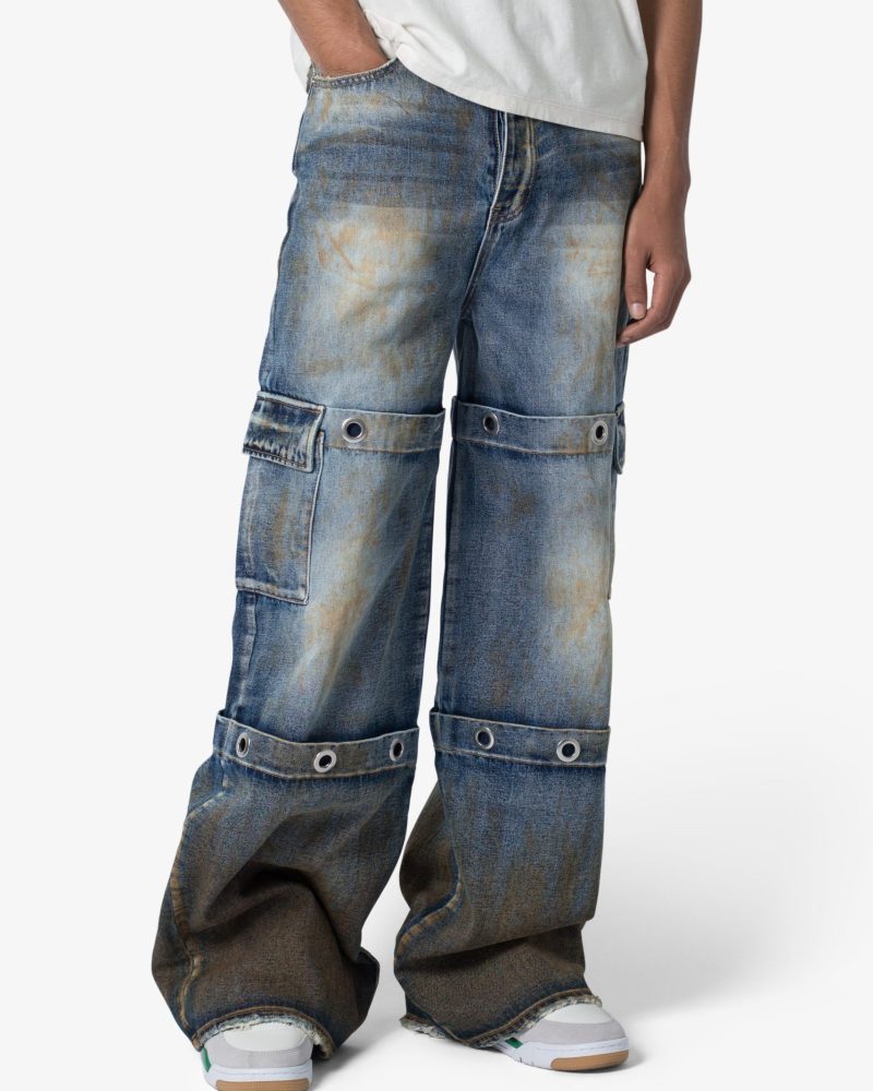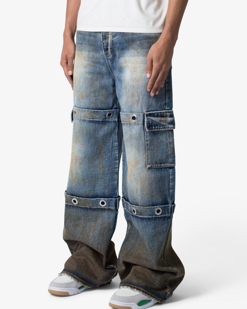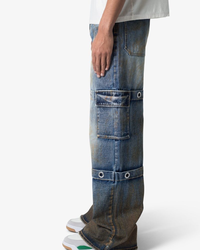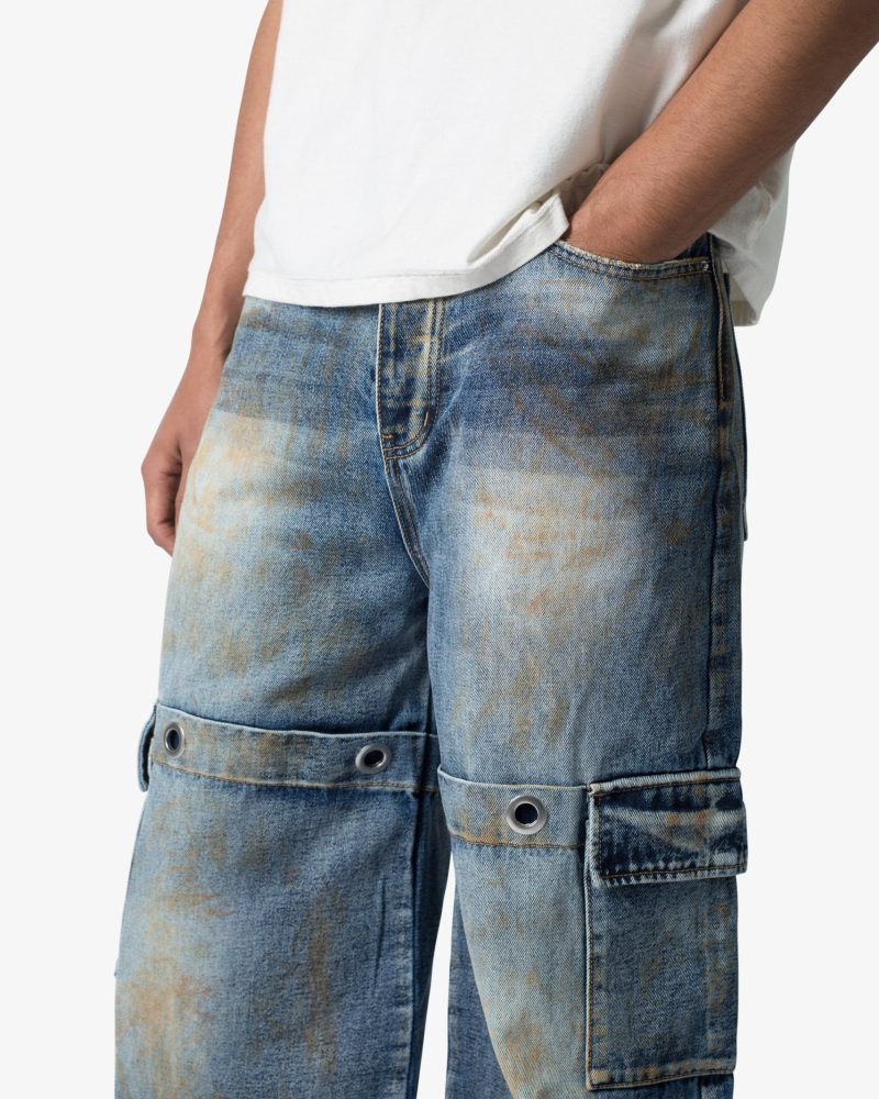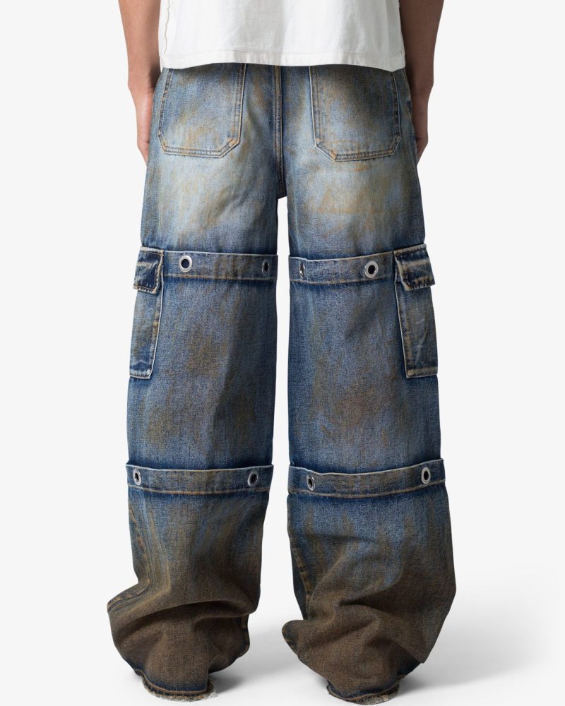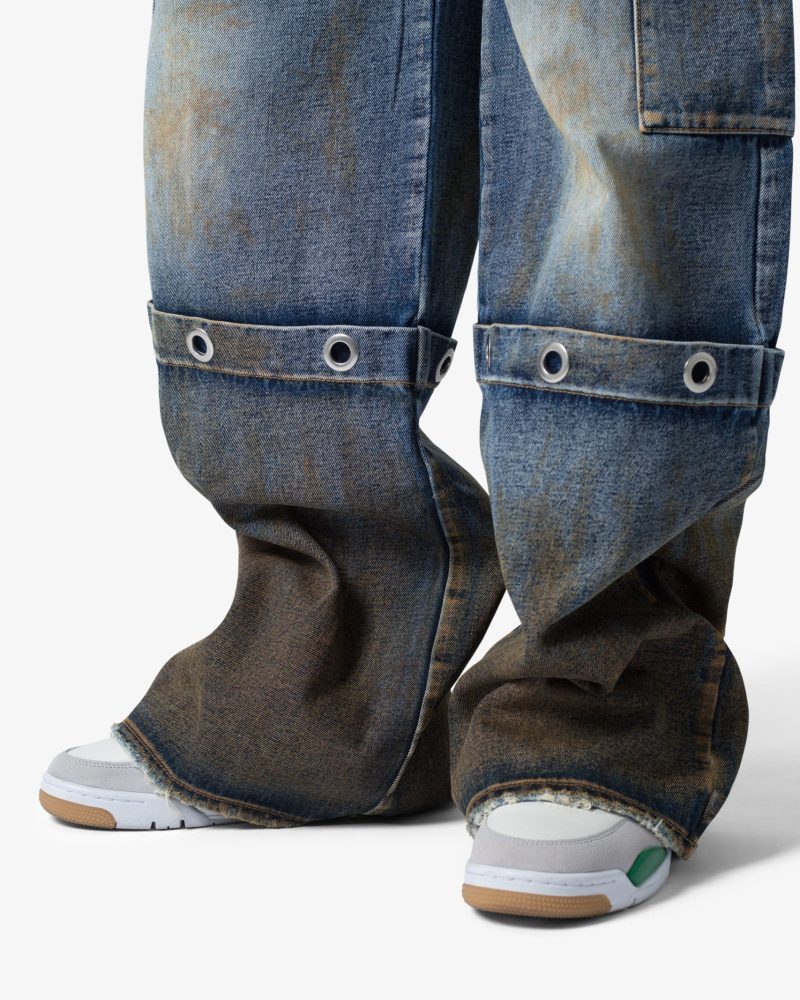 the Void Baggy Ring Denim is a bold addition to our collection. Featuring our latest Void fit with extra room in the waist. hip. and leg opening. along with an extended inseam from our Rave Fit. Constructed from a medium washed blue cotton denim with rust stains throughout. embracing traditional 5 pocket denim details. metal eyelet details on the legs. oversized cargo pockets at the outseam. and finished with a poly coating throughout for a sheen on the fabric.