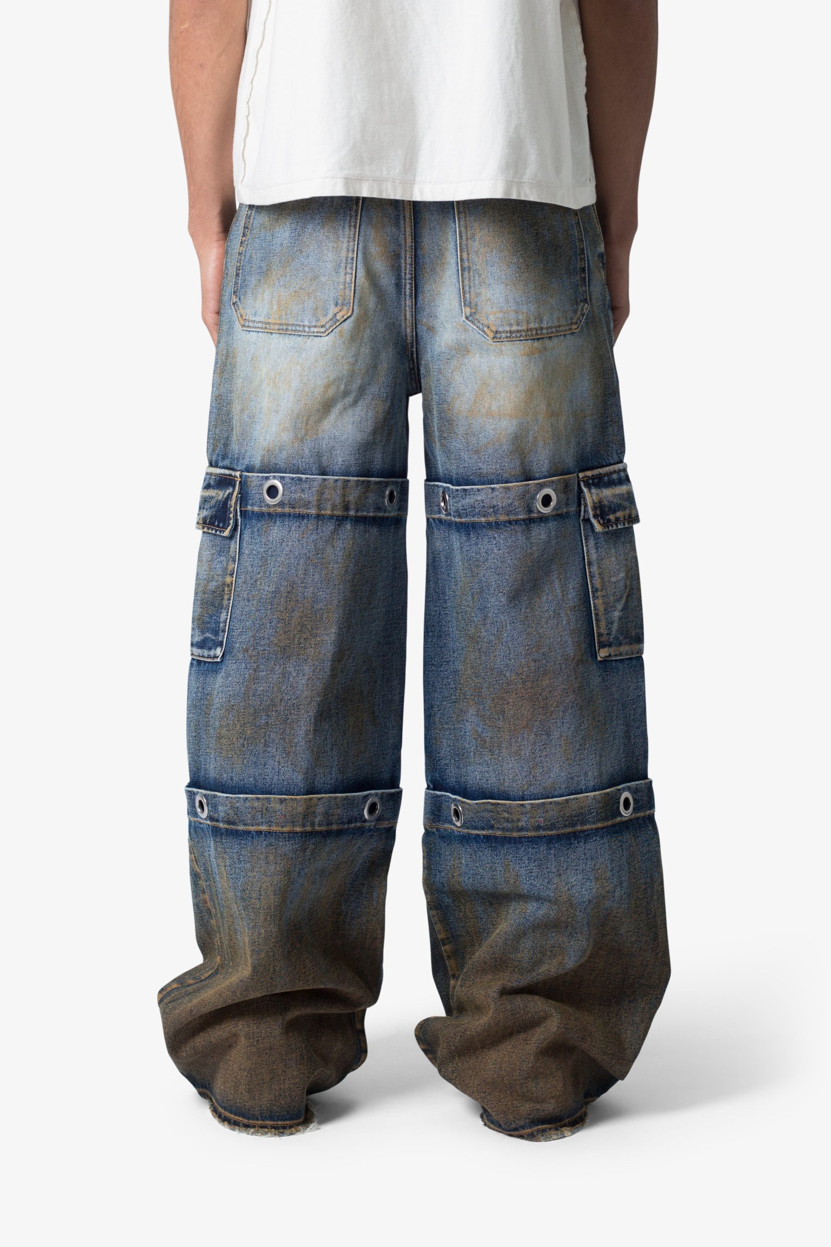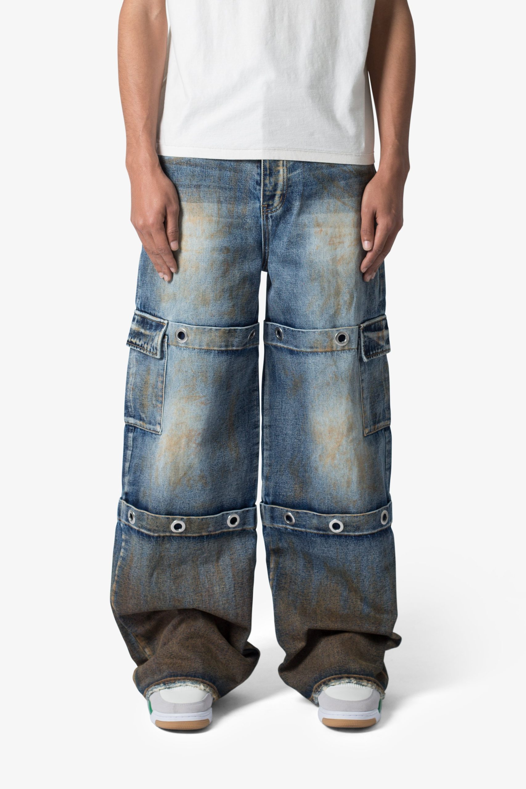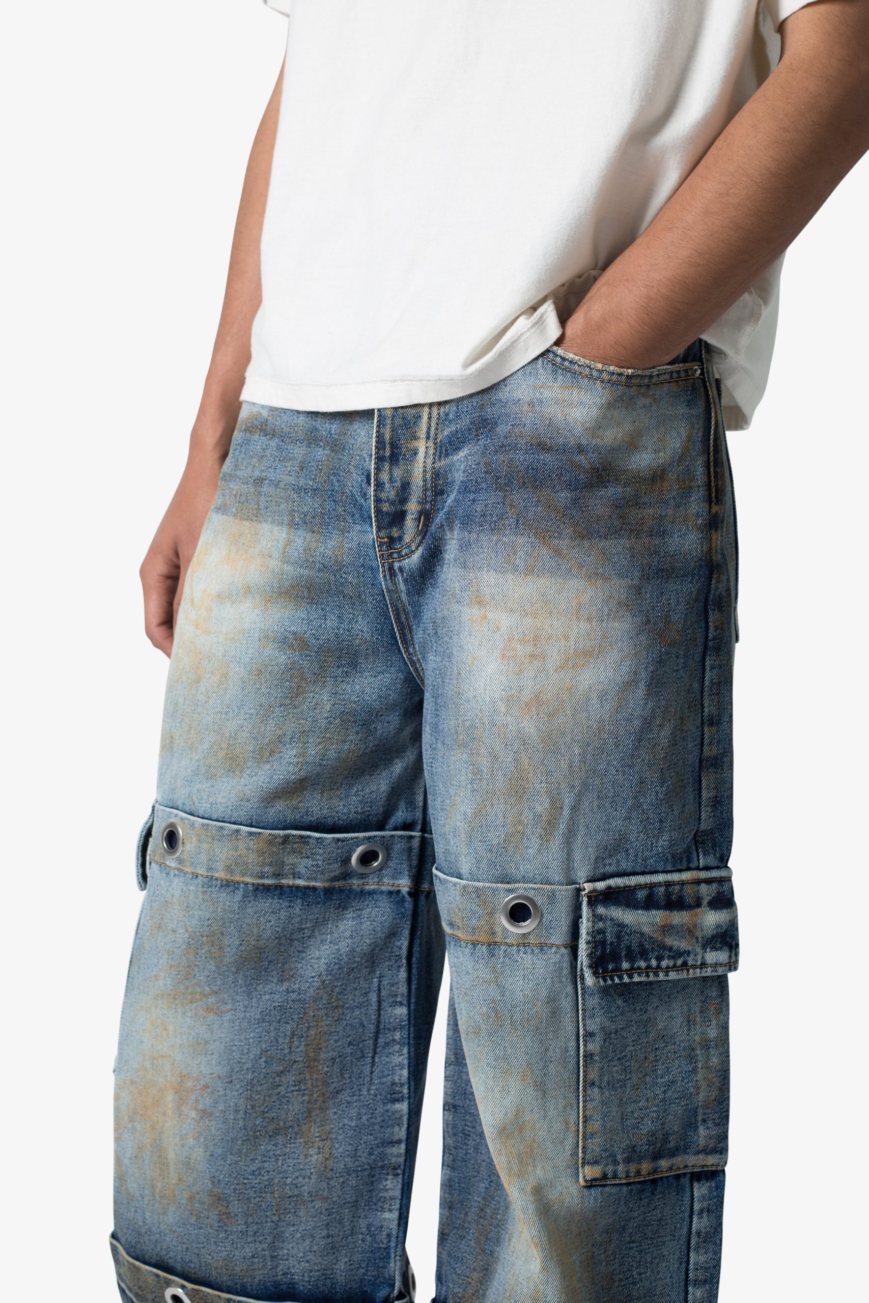 the Void Baggy Ring Denim is a bold addition to our collection. Featuring our latest Void fit with extra room in the waist. hip. and leg opening. along with an extended inseam from our Rave Fit. Constructed from a medium washed blue cotton denim with rust stains throughout. embracing traditional 5 pocket denim details. metal eyelet details on the legs. oversized cargo pockets at the outseam. and finished with a poly coating throughout for a sheen on the fabric.