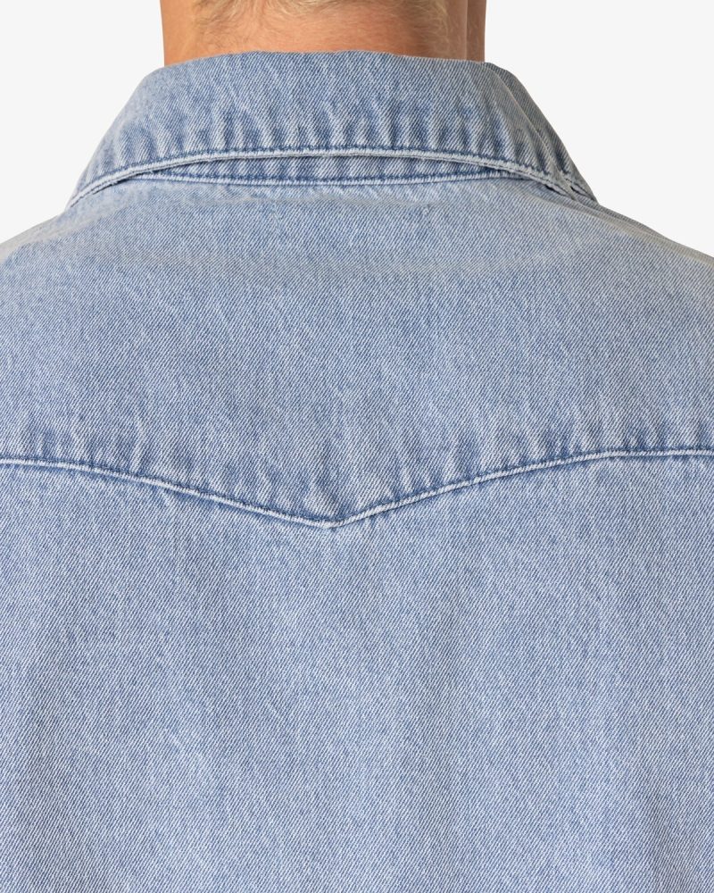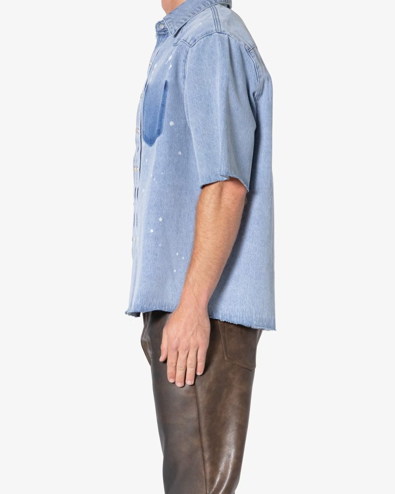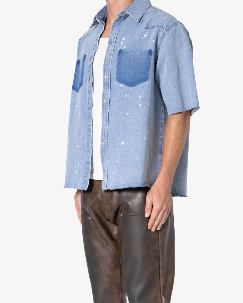 the Washed Denim Button Up Shirt is made from a 100% cotton fabric. light blue base wash. mis-contrast pocket shadowing. bleach spotting. unreleased hem. and white mother of pearl button snaps.