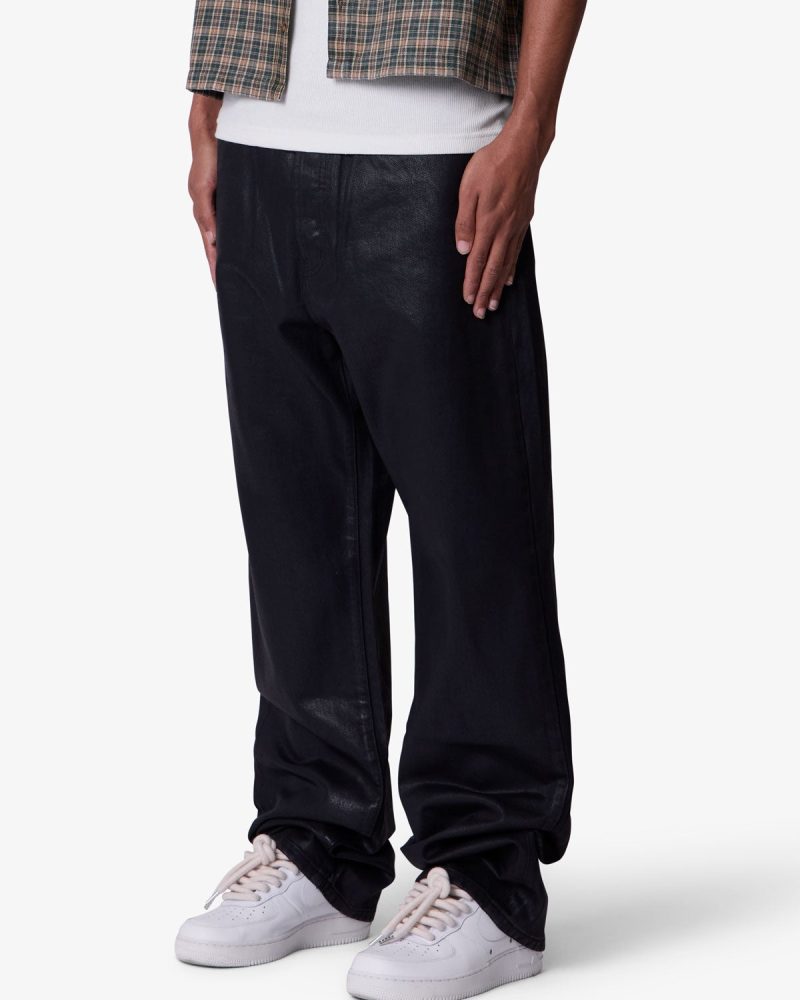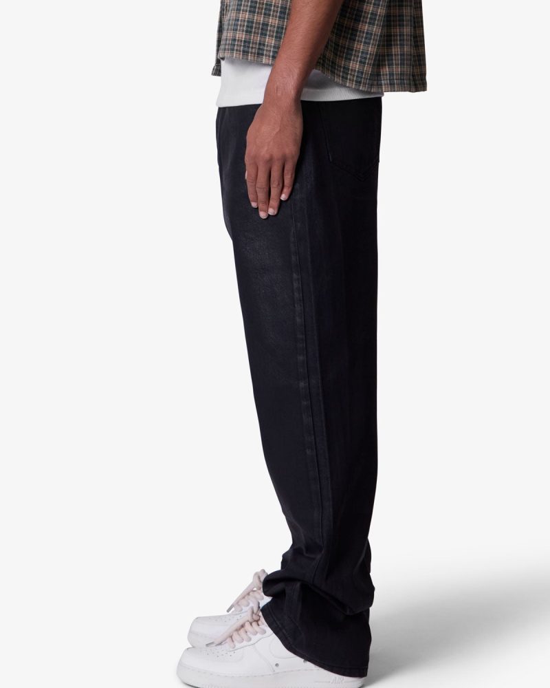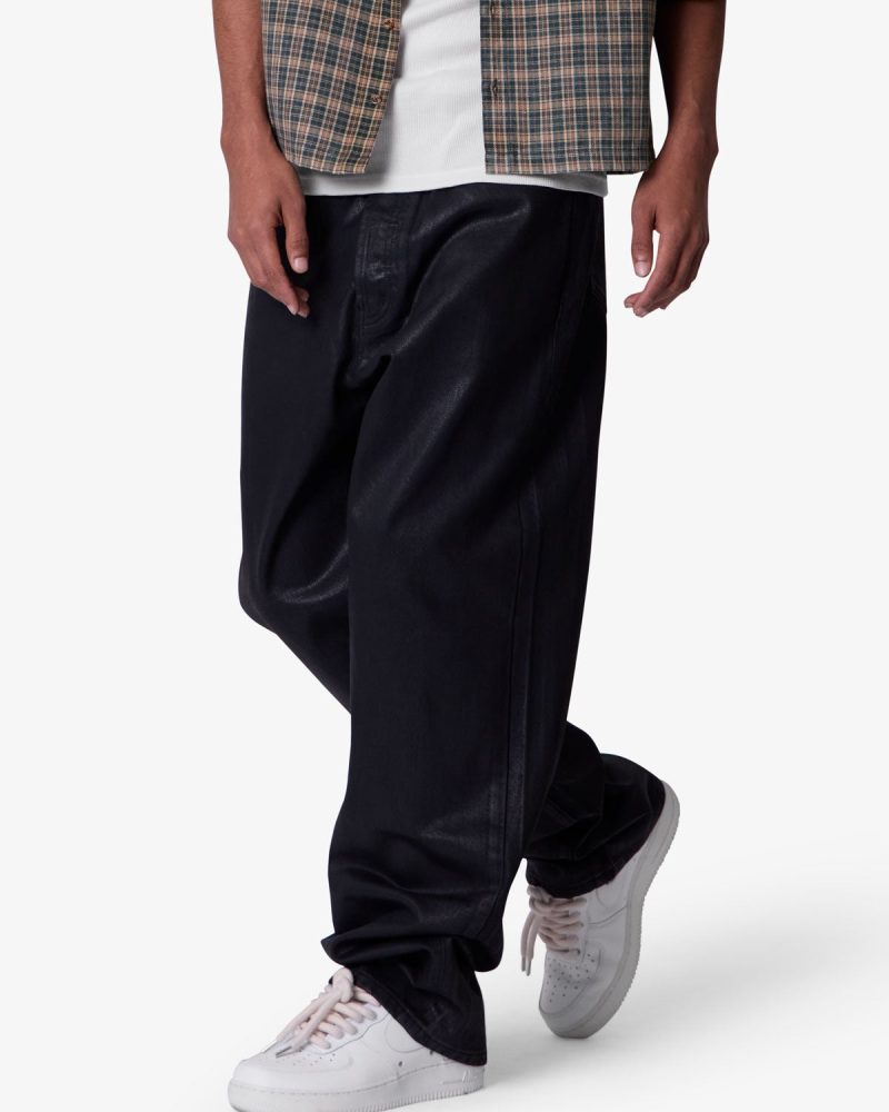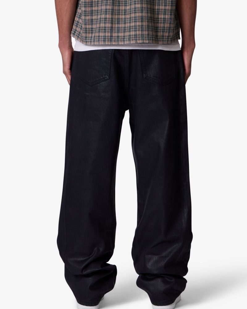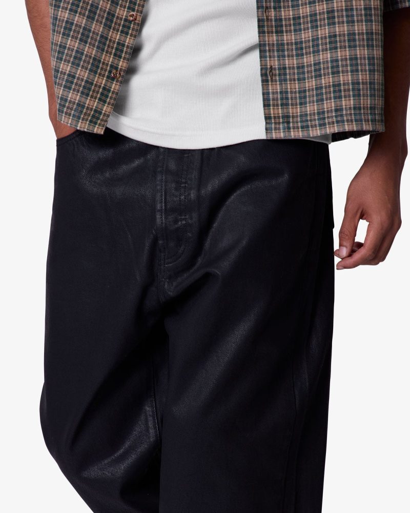 Constructed from a cotton-poly blend black denim with a waxed coating throughout. this baggy denim style features a relaxed fit through the hip and leg. Designed with standard five-pocket construction. belt loops. and a button closure at the waistband.