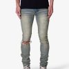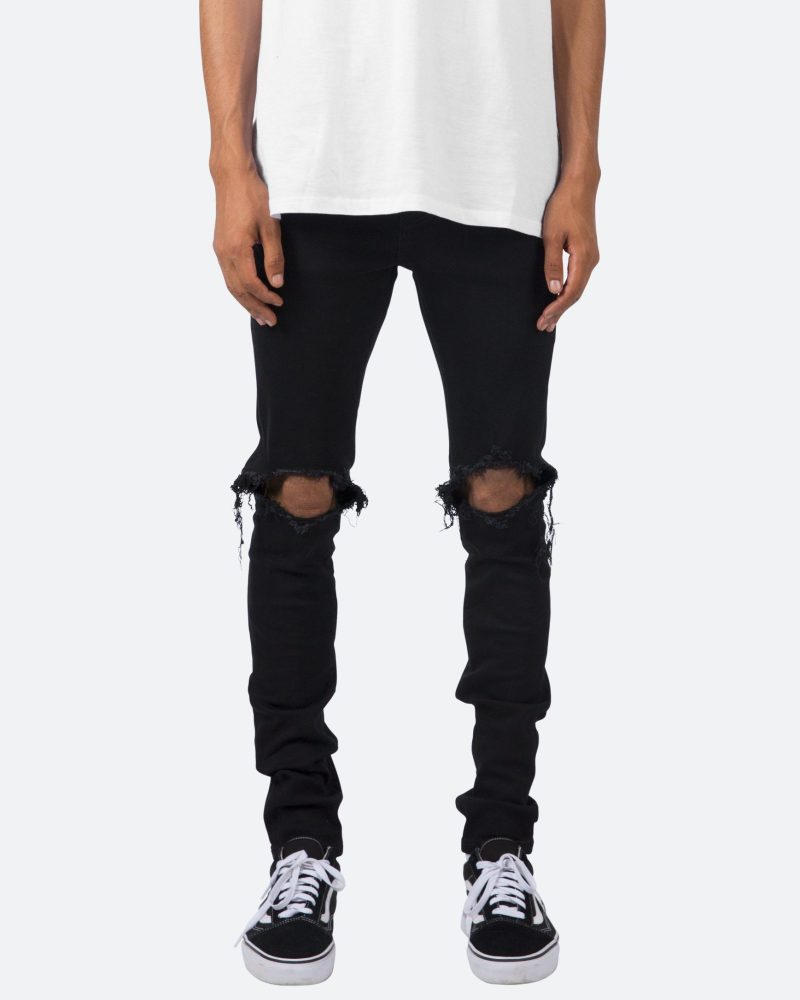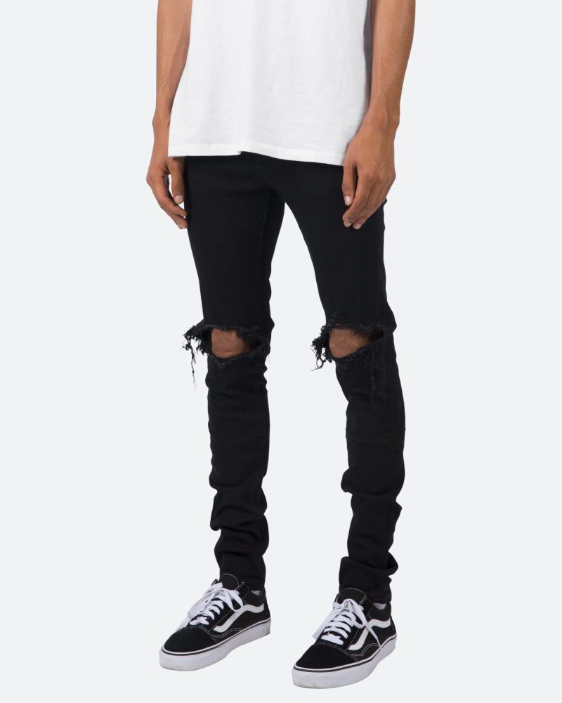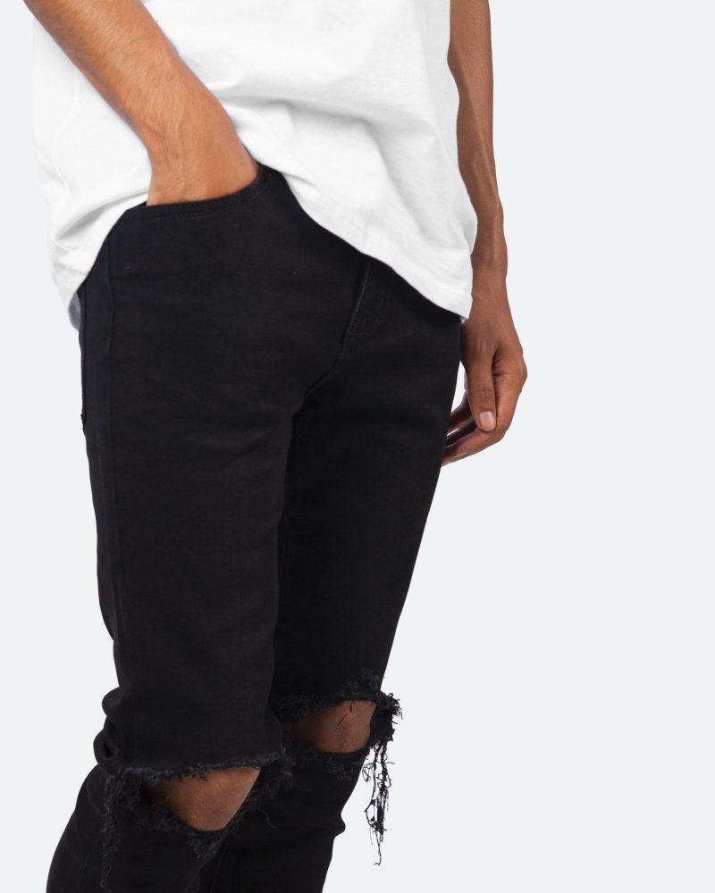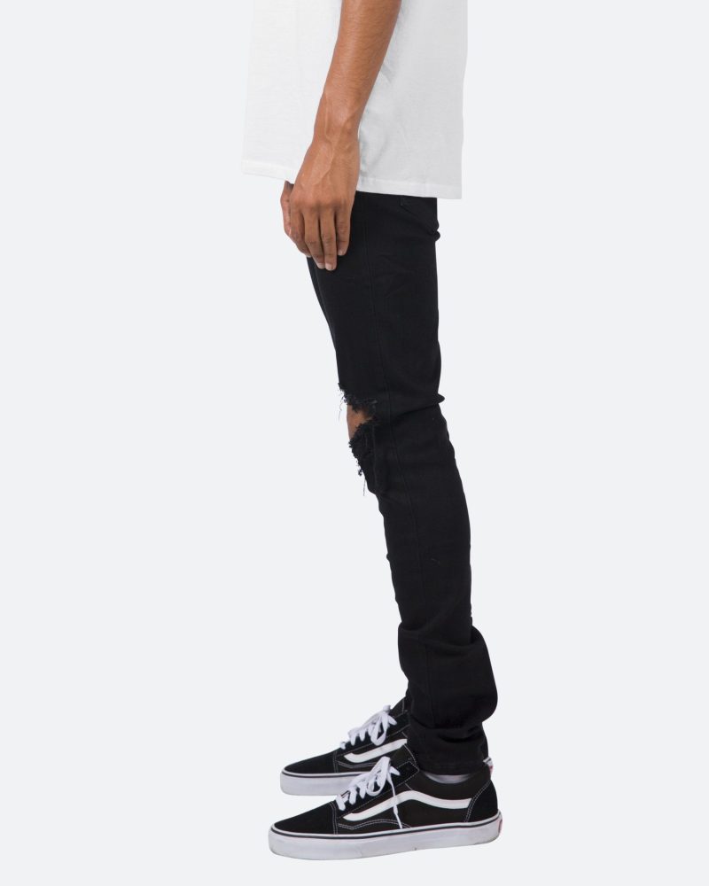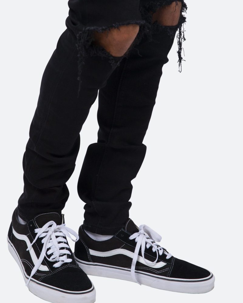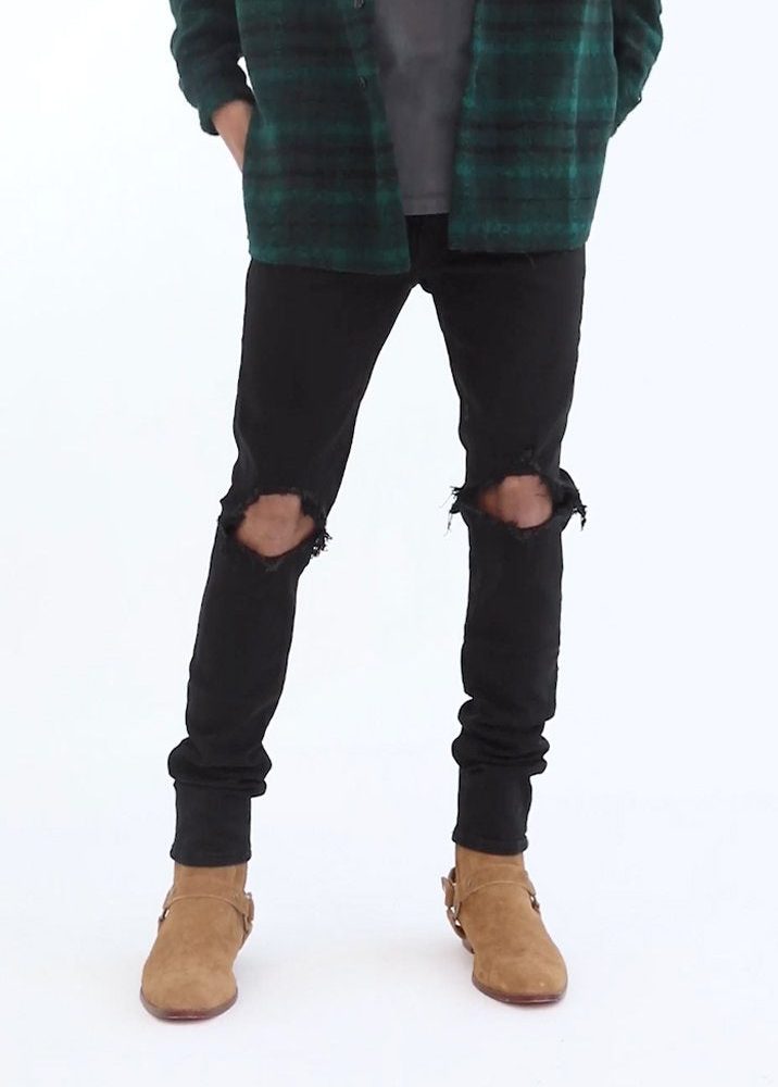 the X1 Skinny Denim is designed with our new X fit which is skinny throughout with an extended inseam for stacking. and features a vintage black wash and custom distressing at the knees.