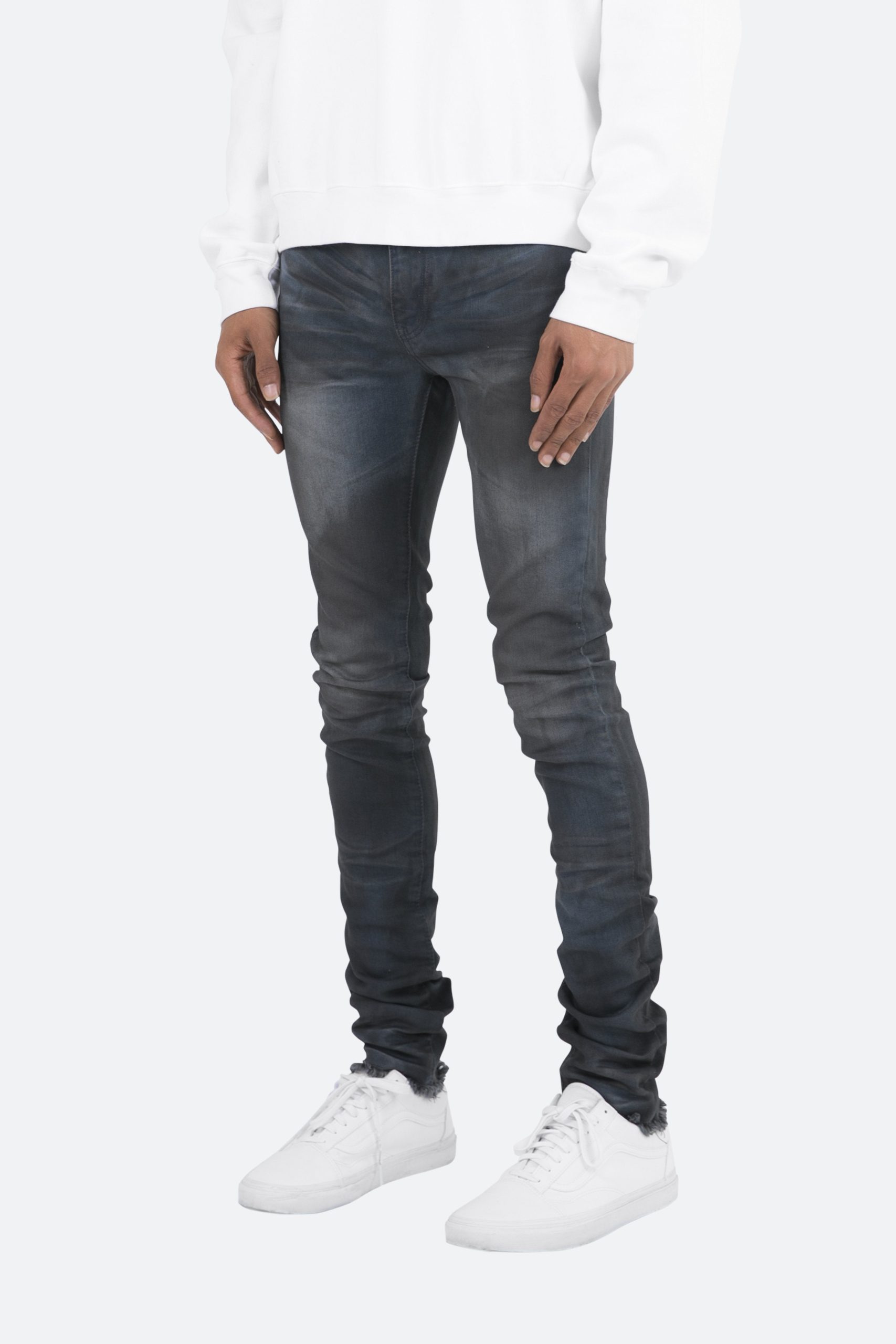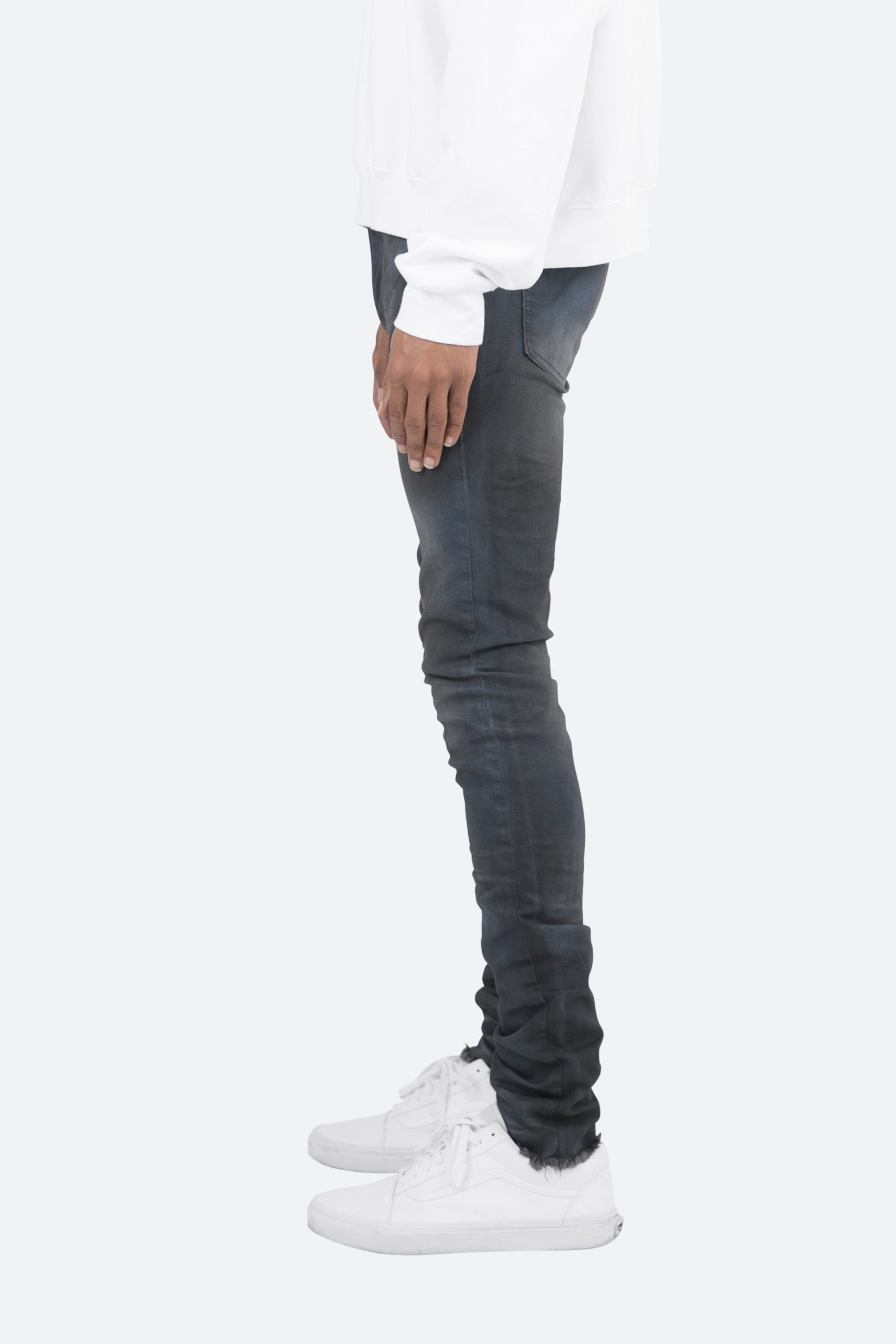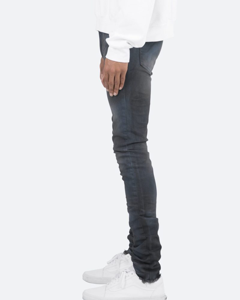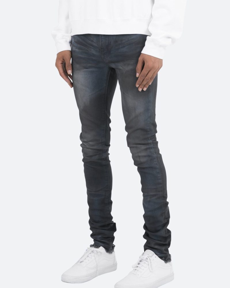 the X116 Stretch Denim is designed with our new X fit which is skinny throughout with an extended inseam for stacking. and features dark wax treatment over a medium wash blue denim base.