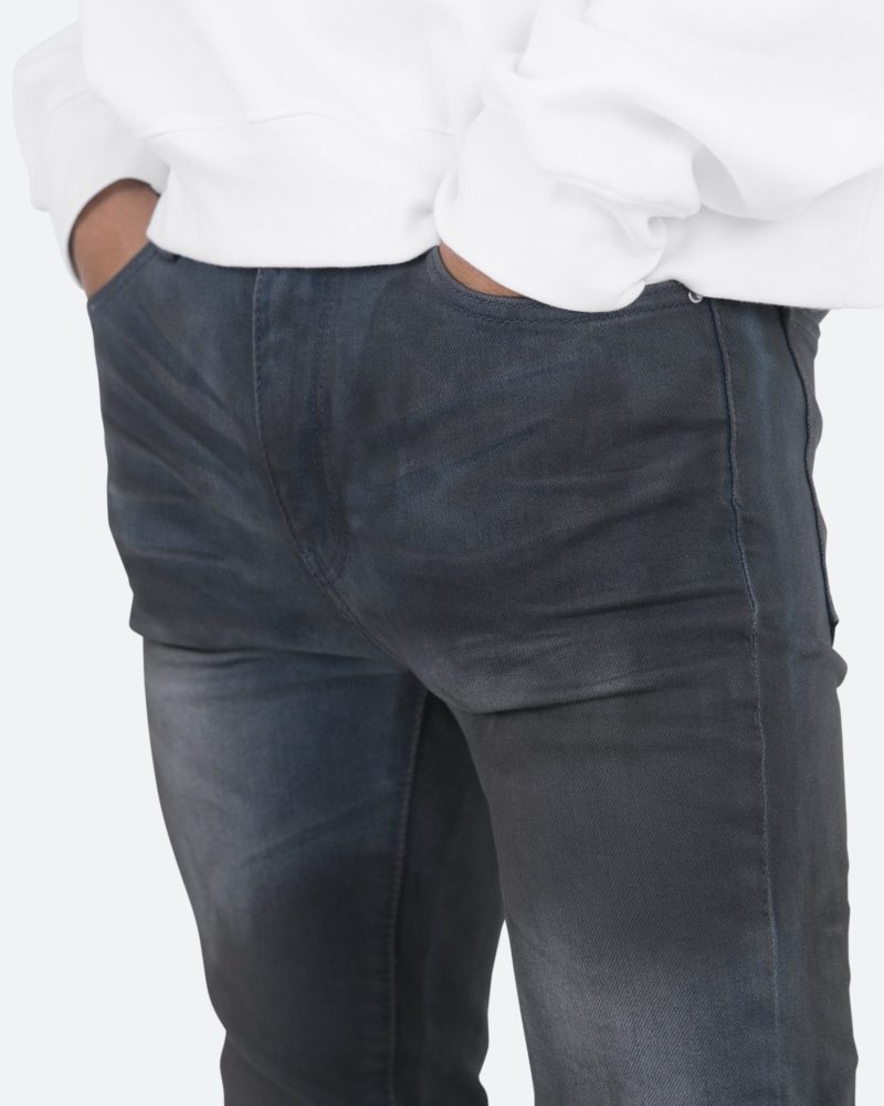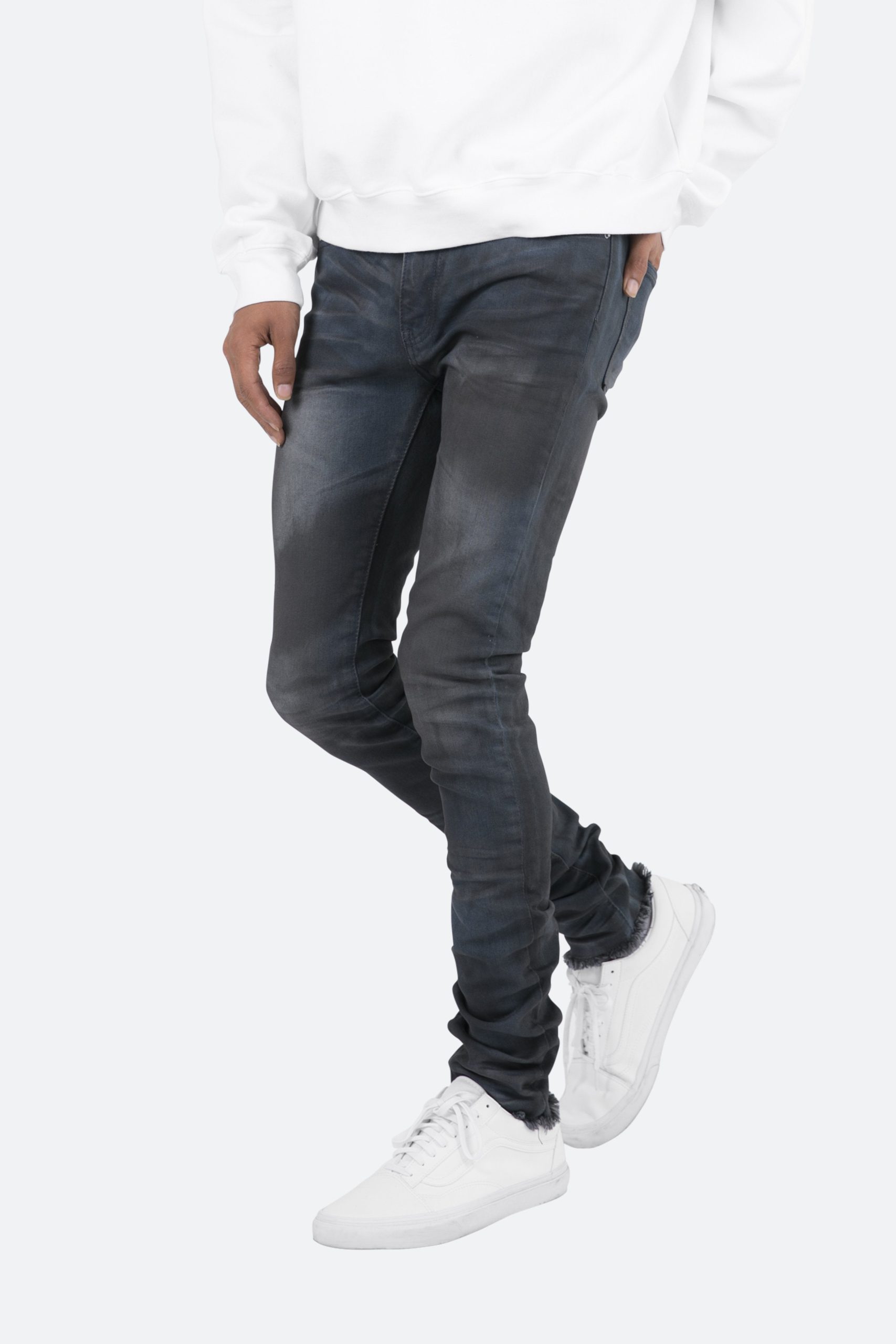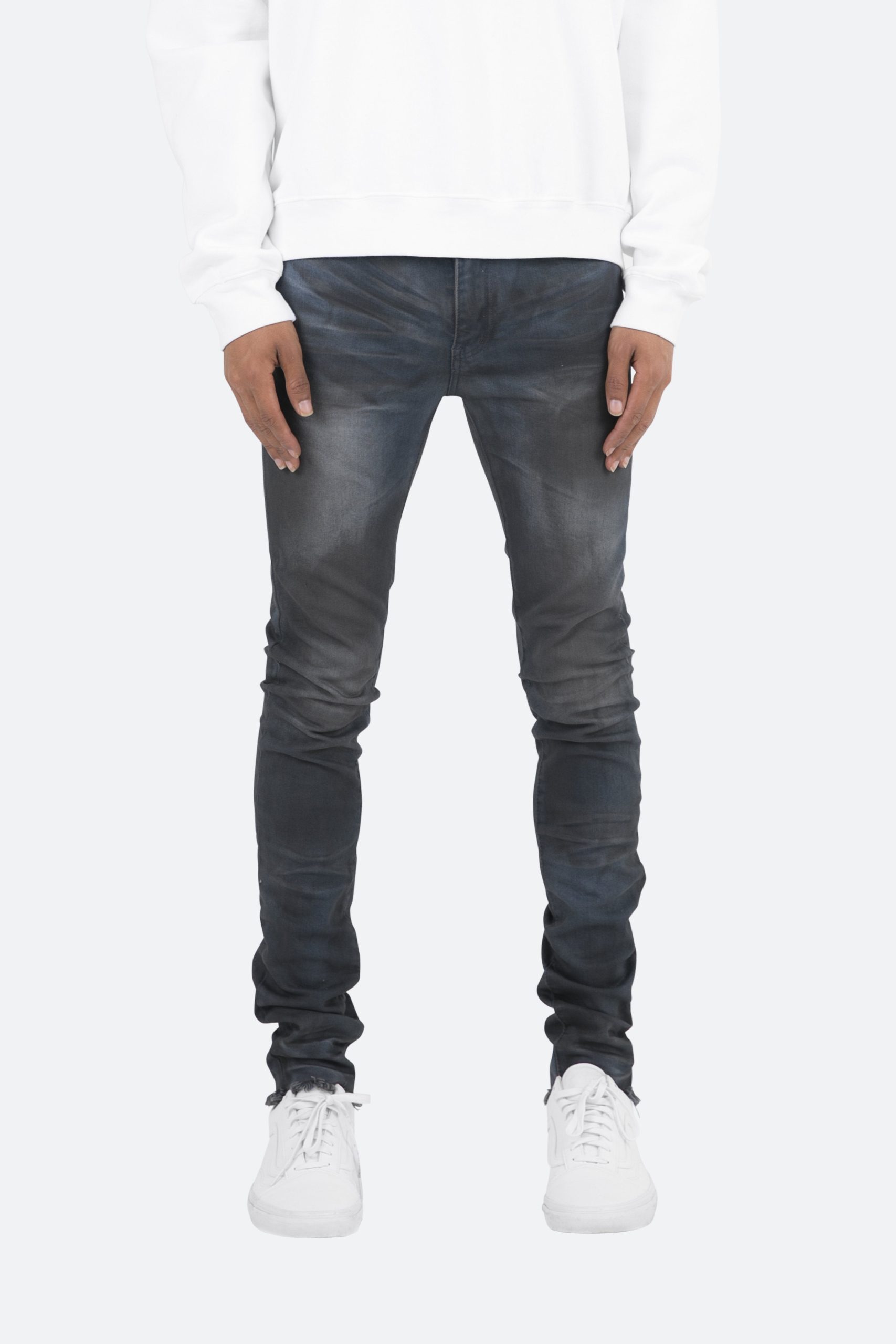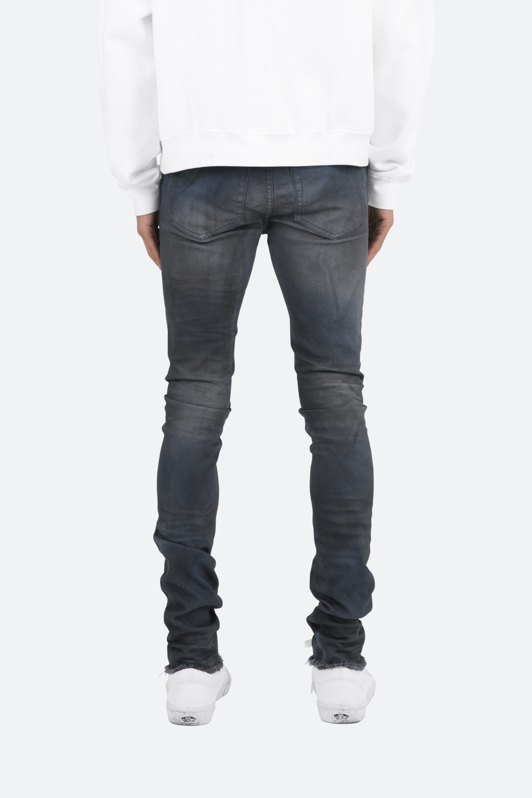 the X116 Stretch Denim is designed with our new X fit which is skinny throughout with an extended inseam for stacking. and features dark wax treatment over a medium wash blue denim base.
