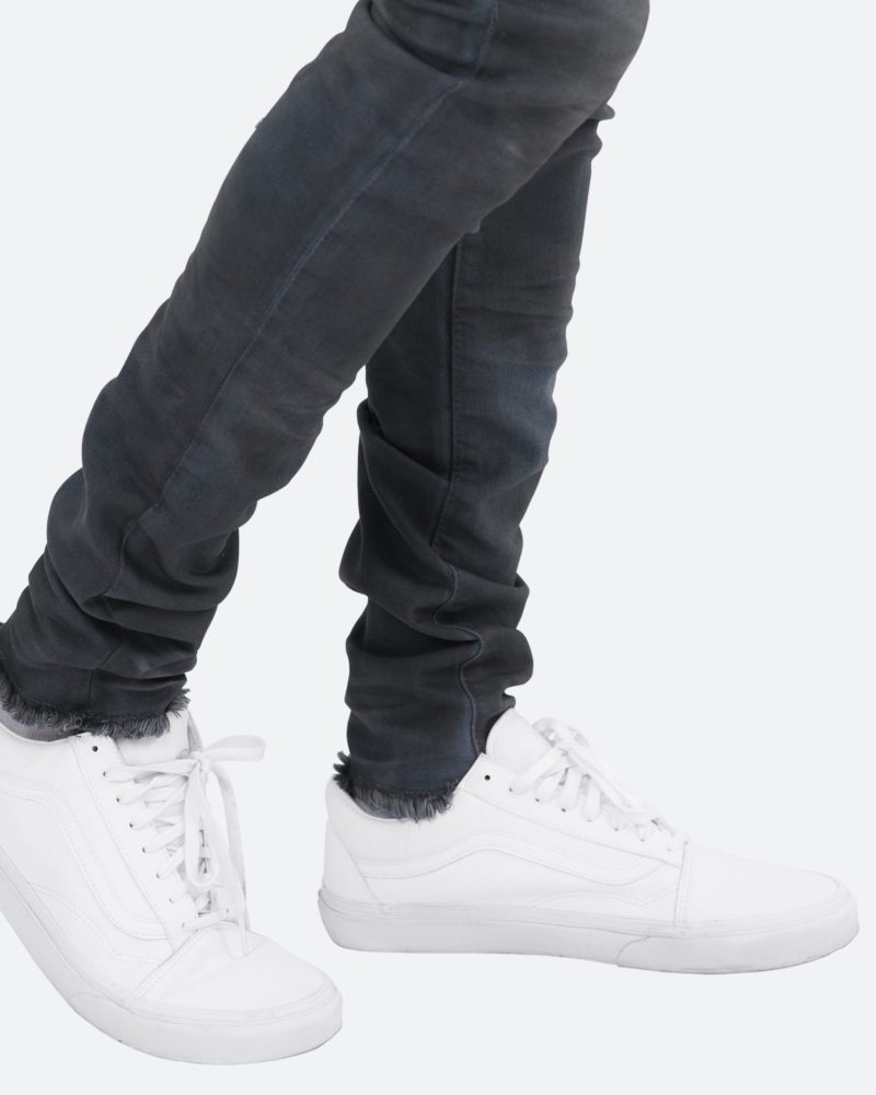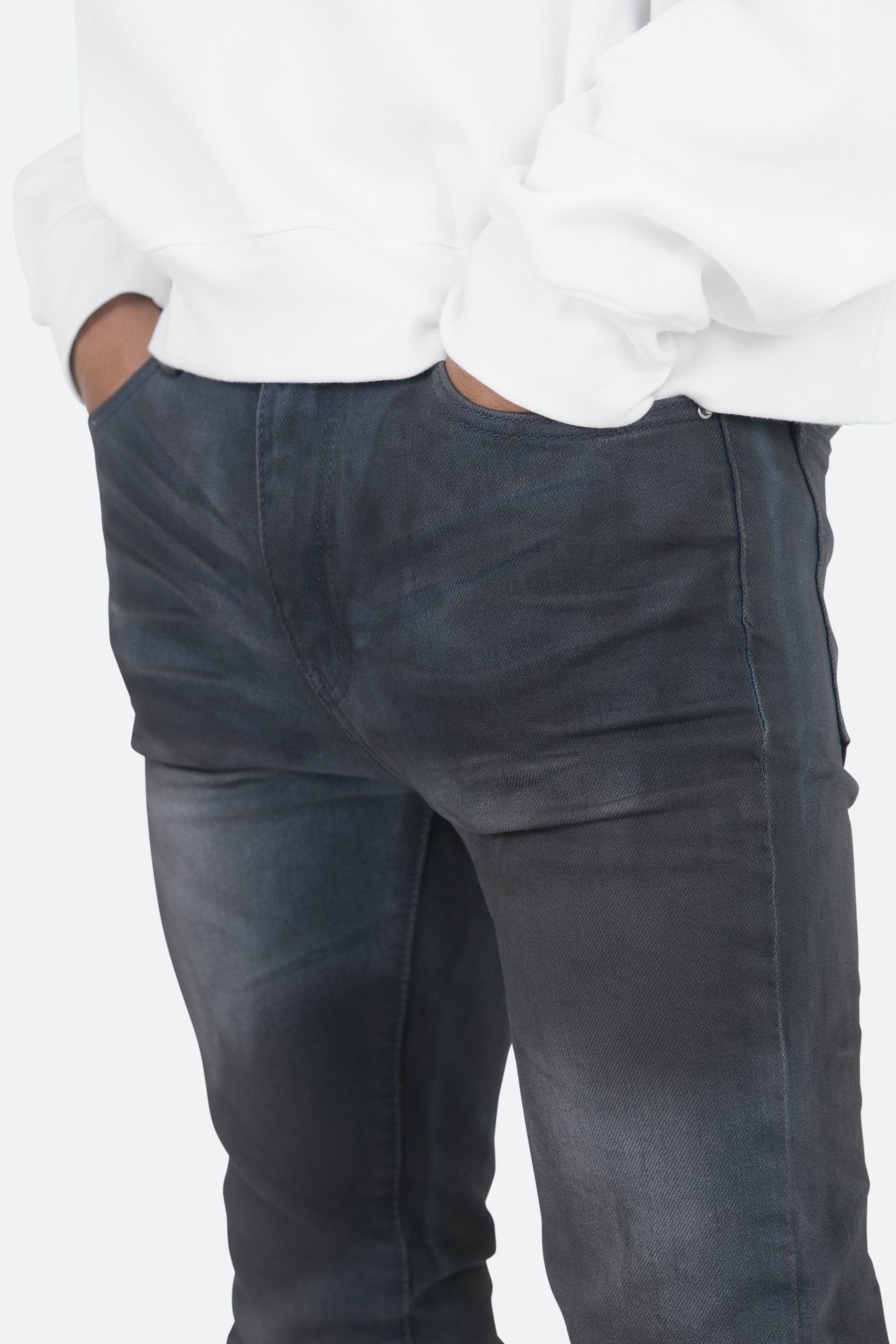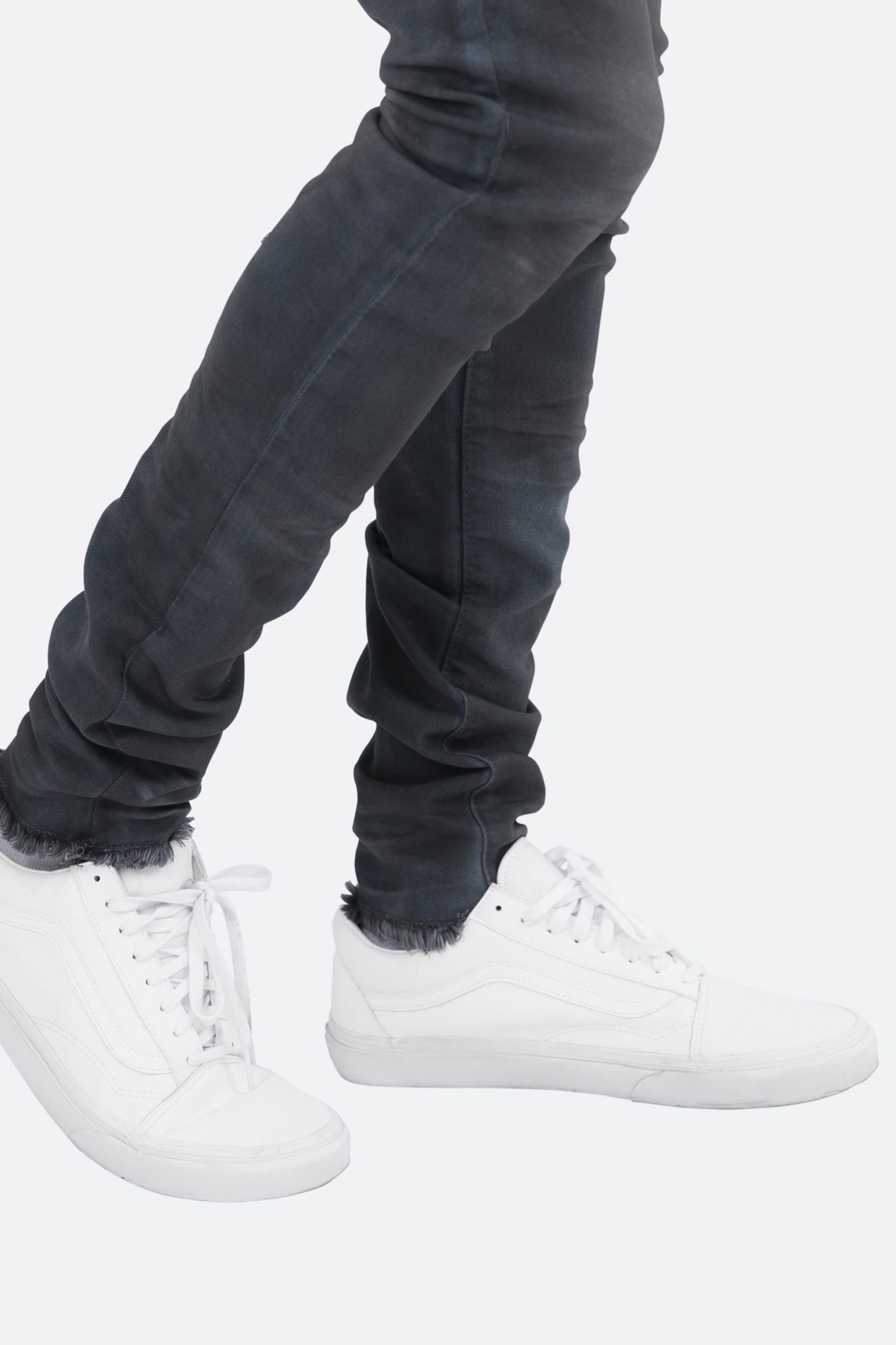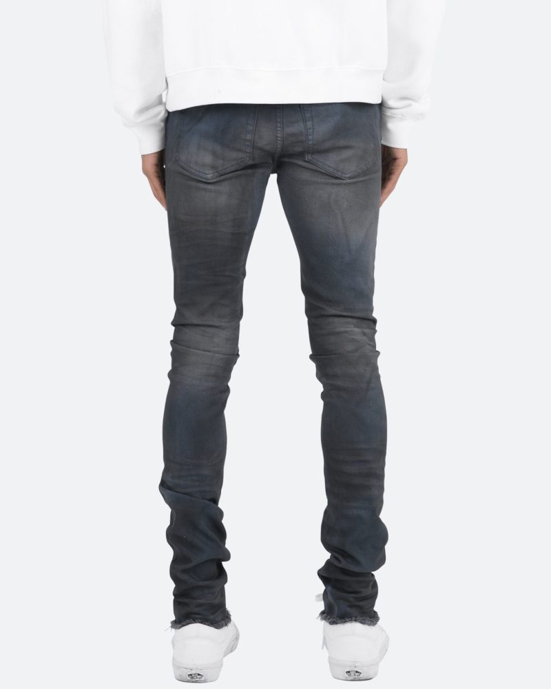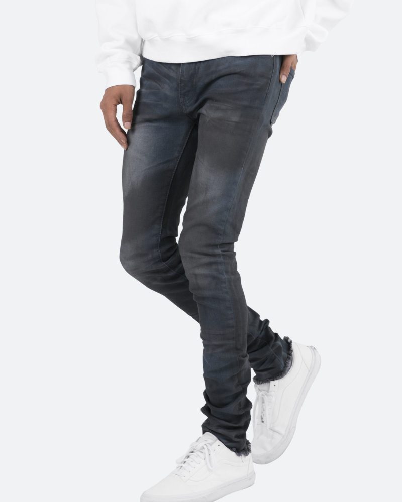 the X116 Stretch Denim is designed with our new X fit which is skinny throughout with an extended inseam for stacking. and features dark wax treatment over a medium wash blue denim base.