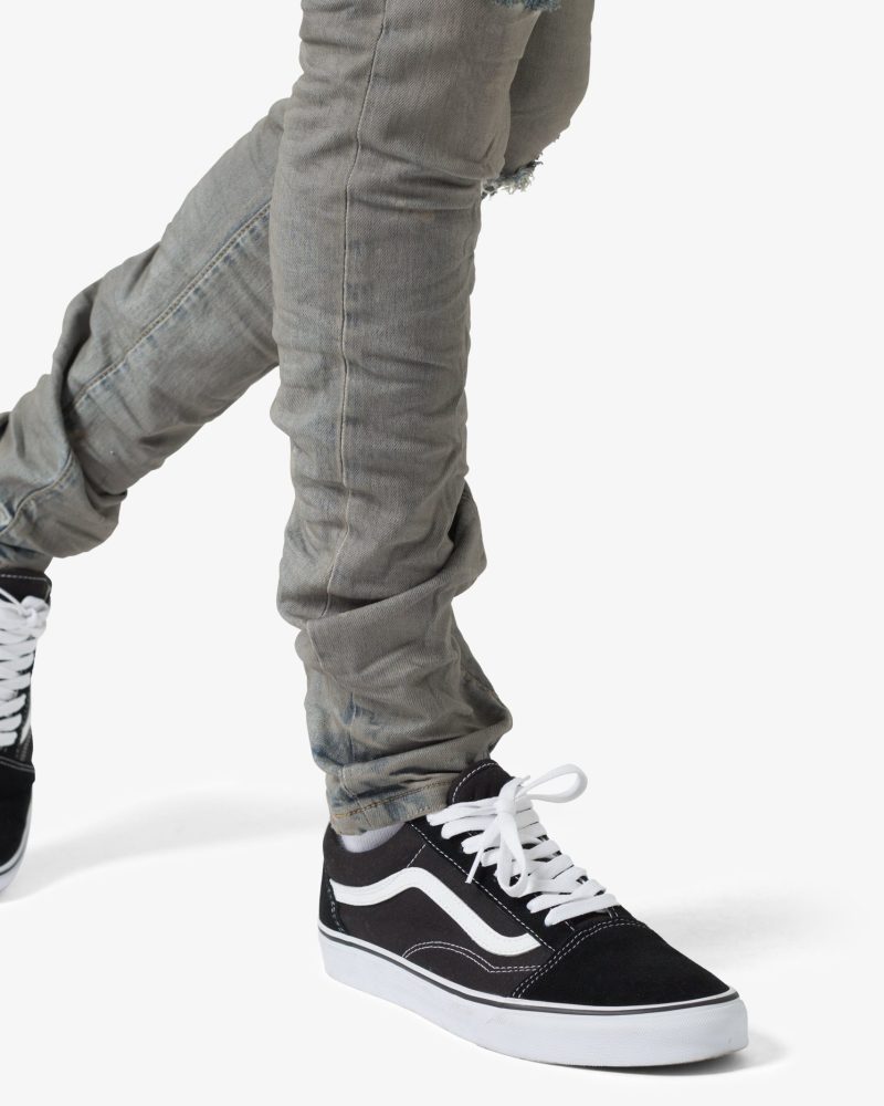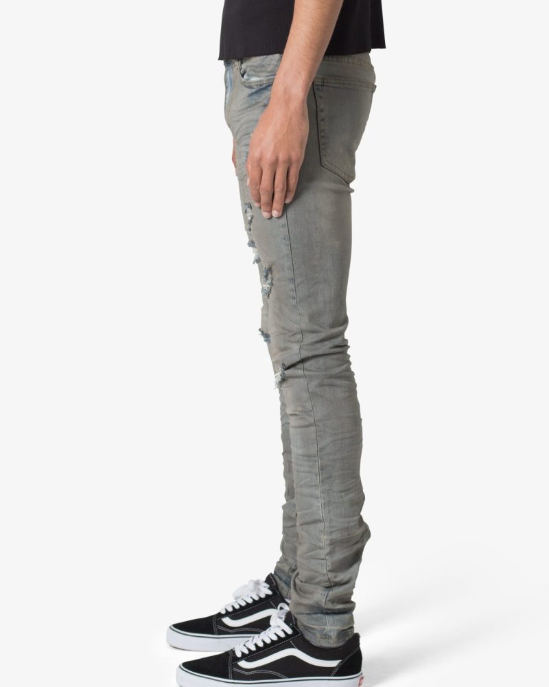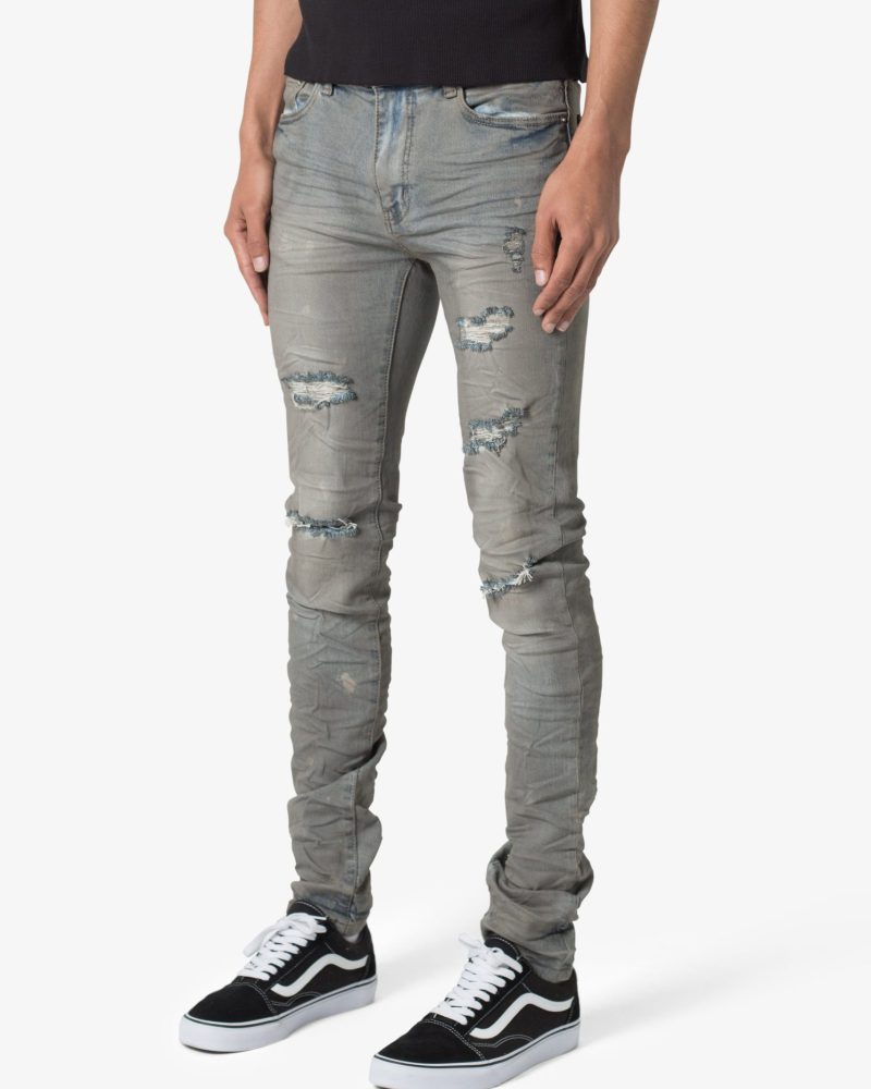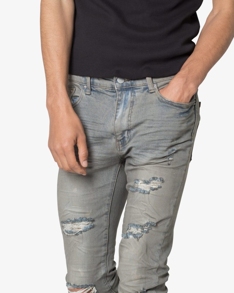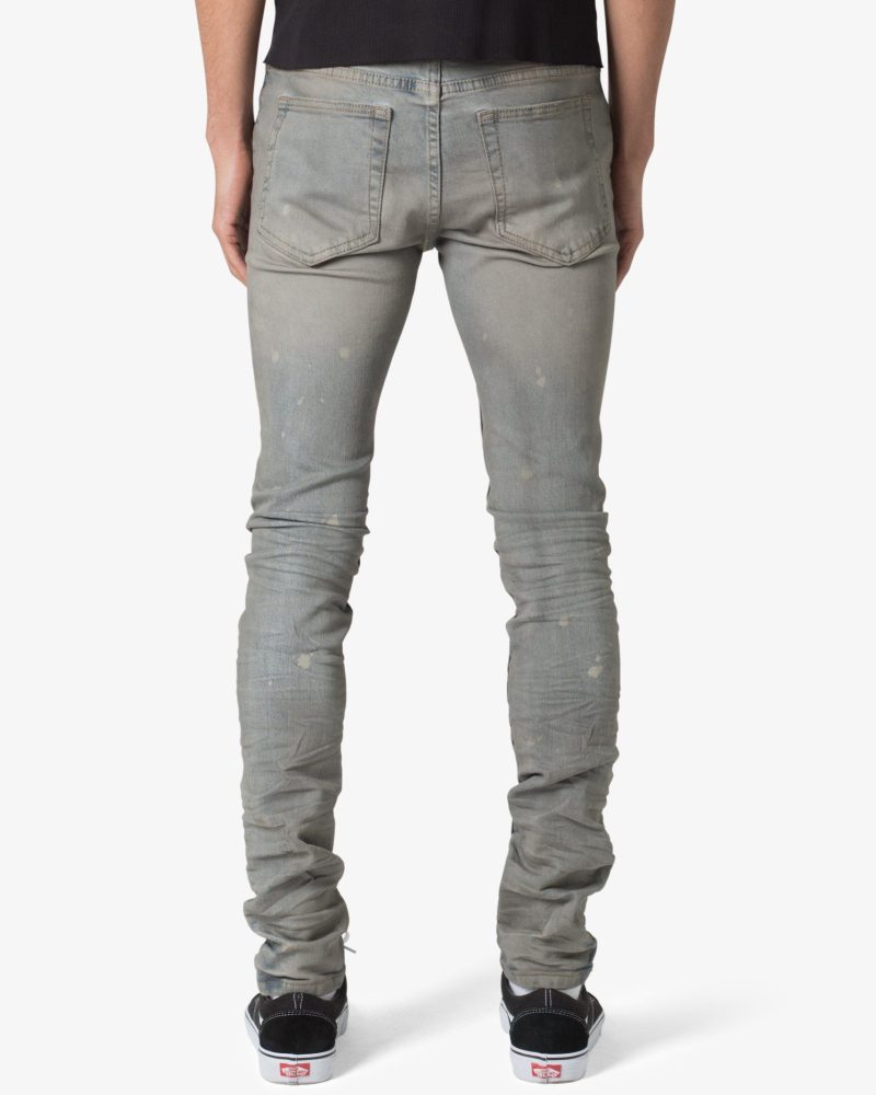 the X607 Painted Skinny Denim is designed with our X fit. which is skinny throughout with an extended inseam for stacking. and features a vintage blue wash with a dirt tint. paint details throughout. and finished with distressing details.