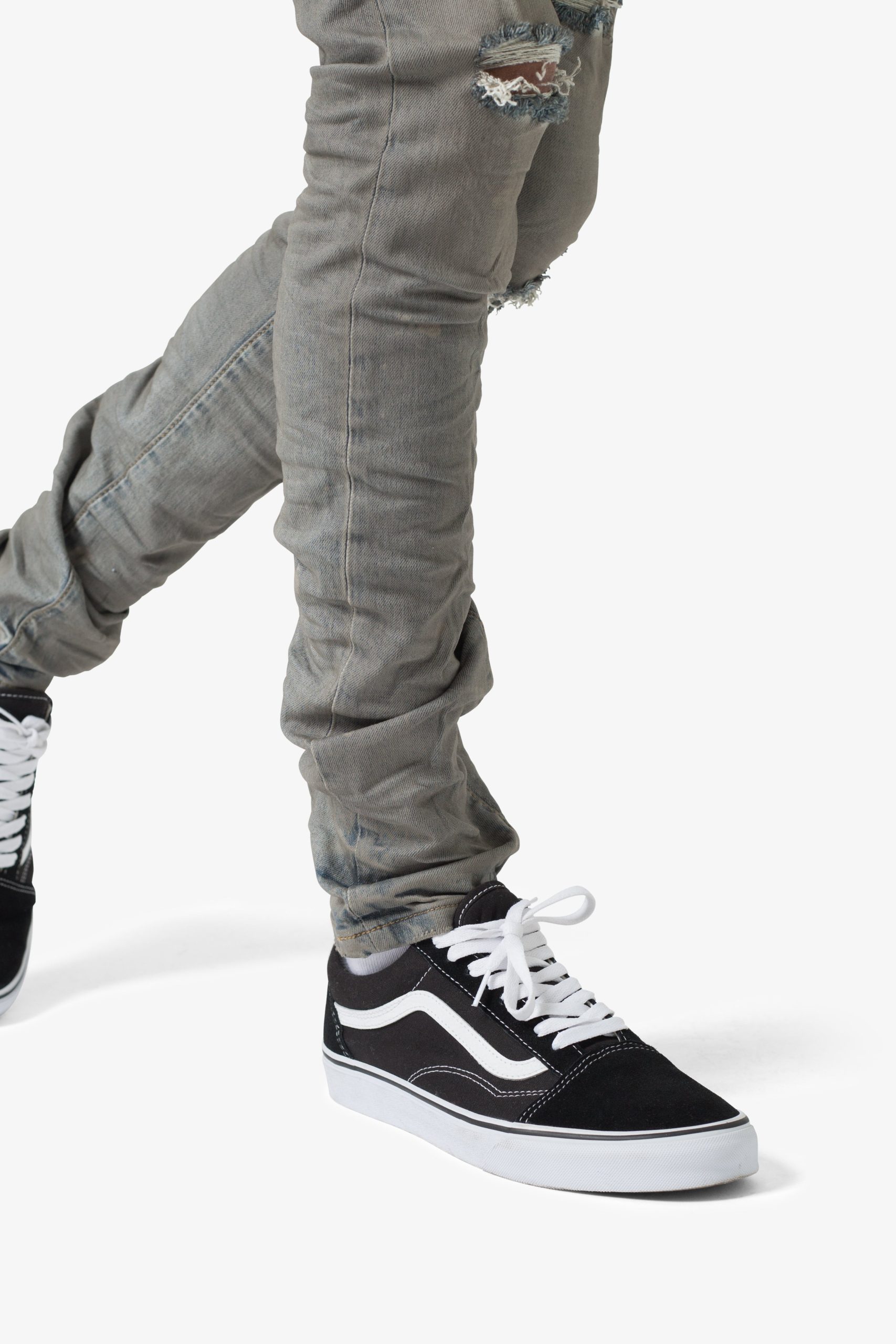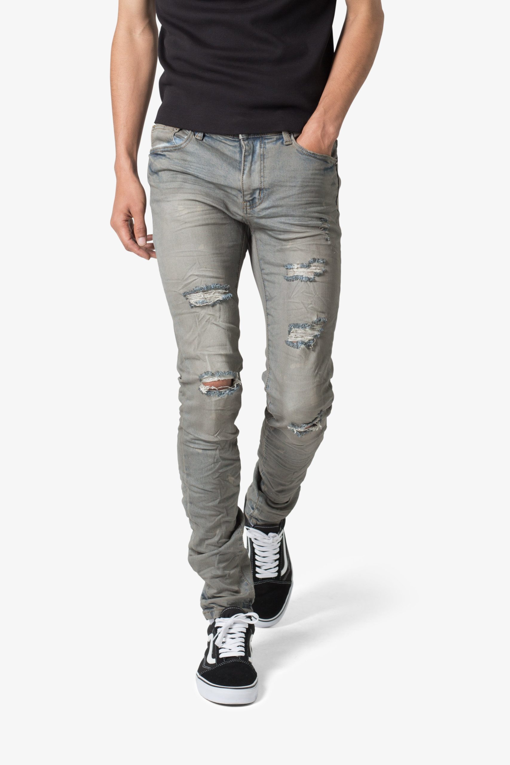 the X607 Painted Skinny Denim is designed with our X fit. which is skinny throughout with an extended inseam for stacking. and features a vintage blue wash with a dirt tint. paint details throughout. and finished with distressing details.