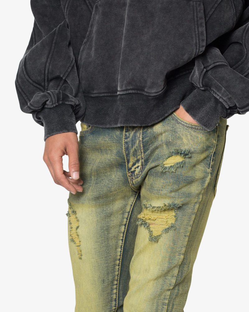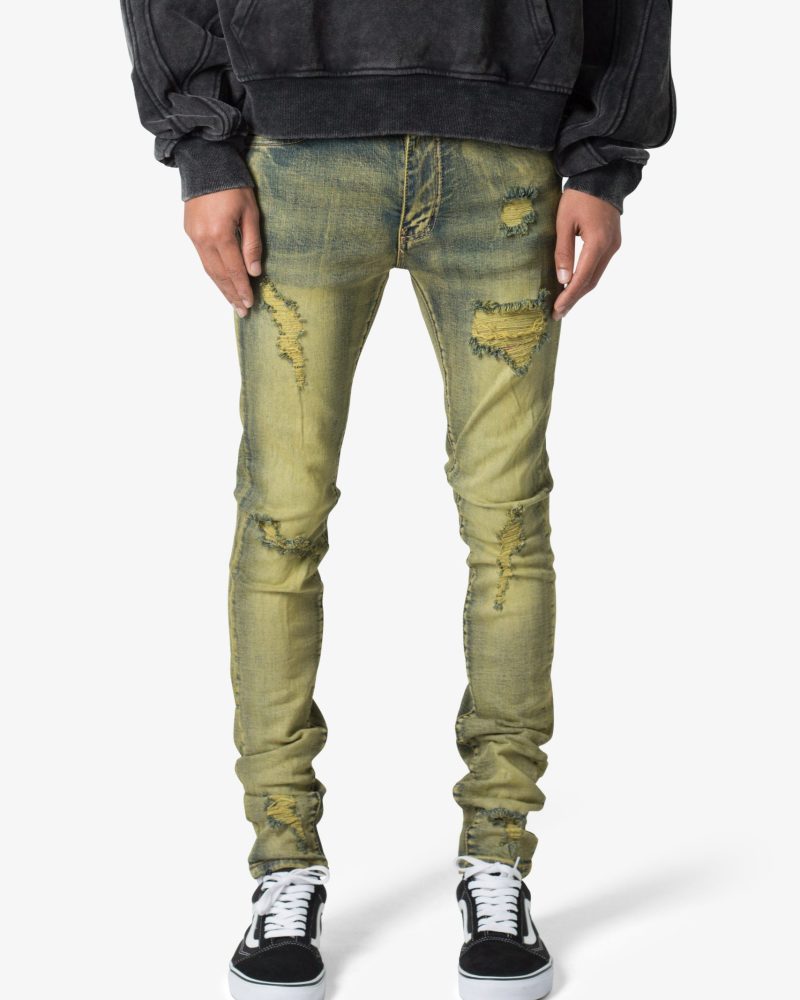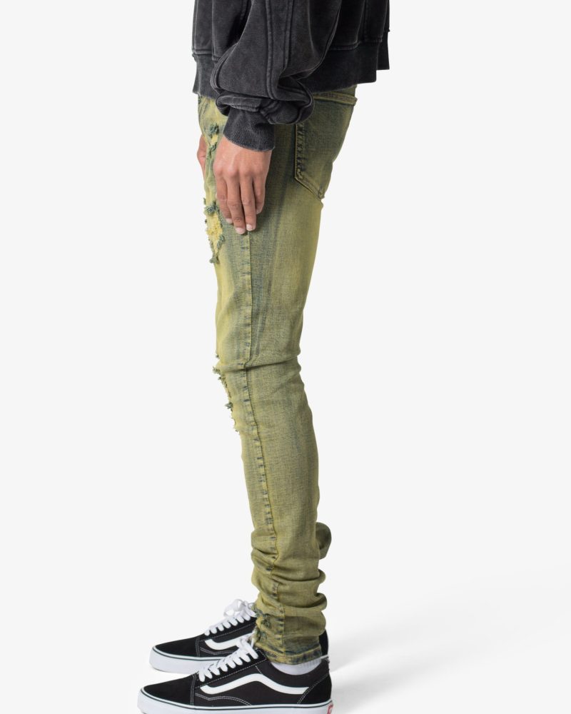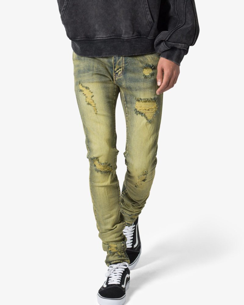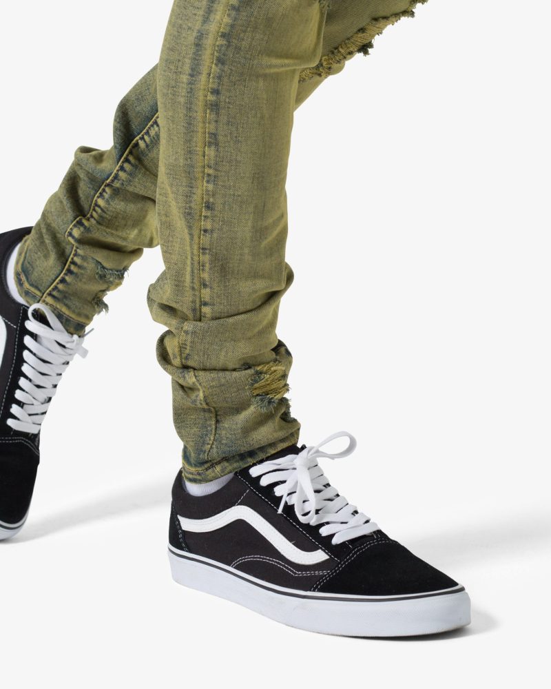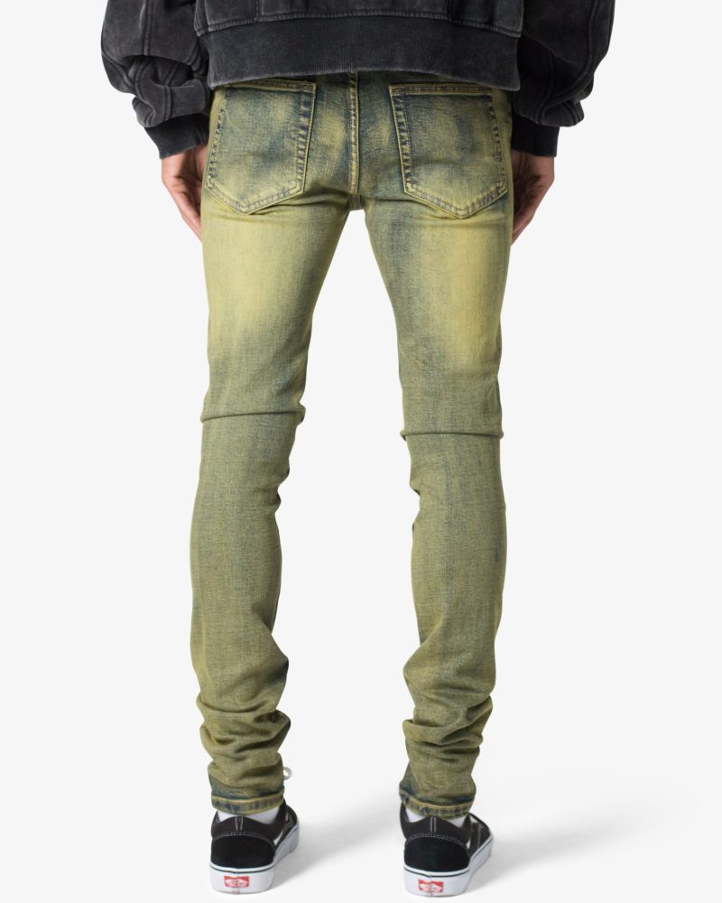 the X609 Algae Skinny Denim is designed with our X fit. which is skinny throughout with an extended inseam for stacking. and features a vintage blue wash with a green tint. and finished with distressing details.