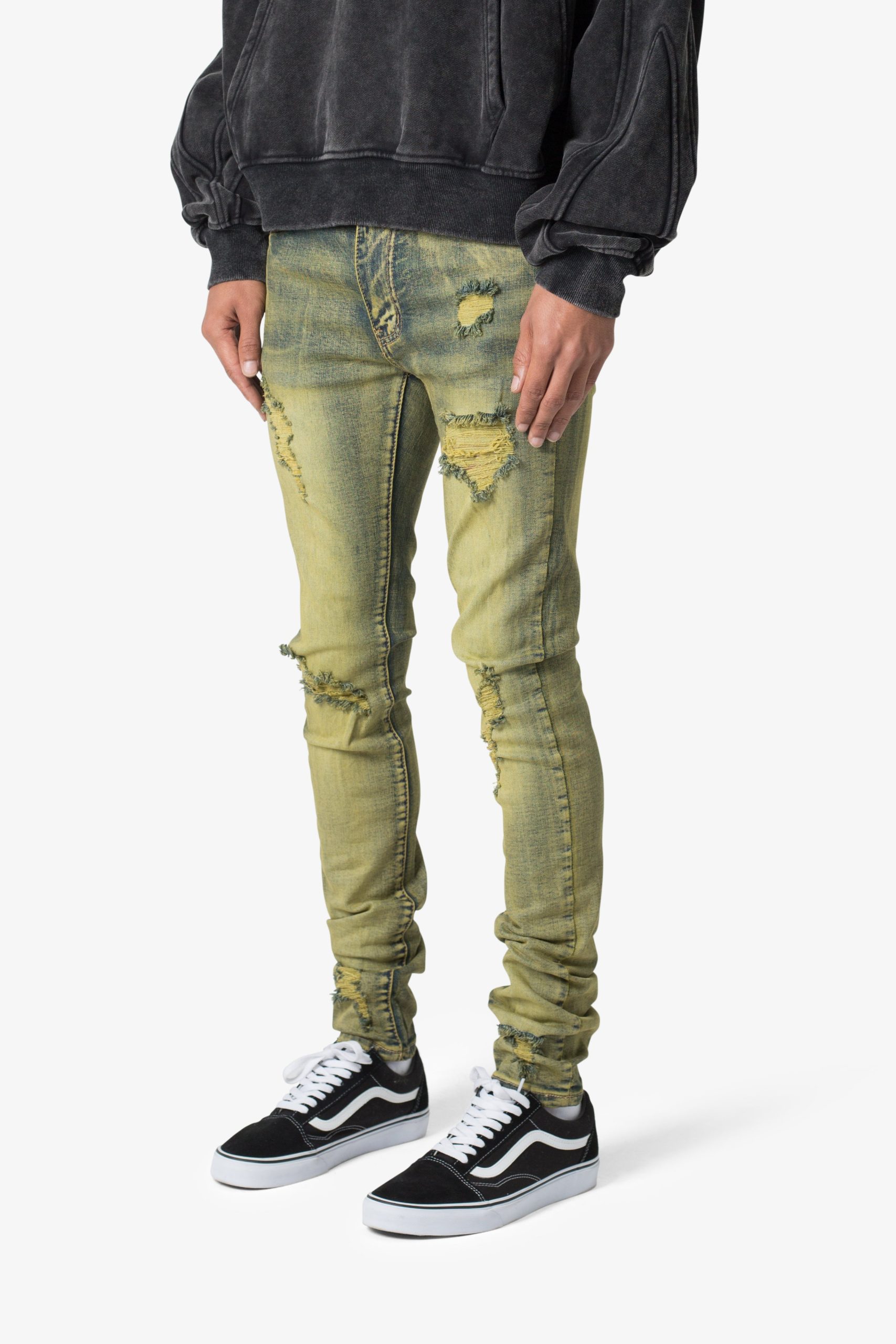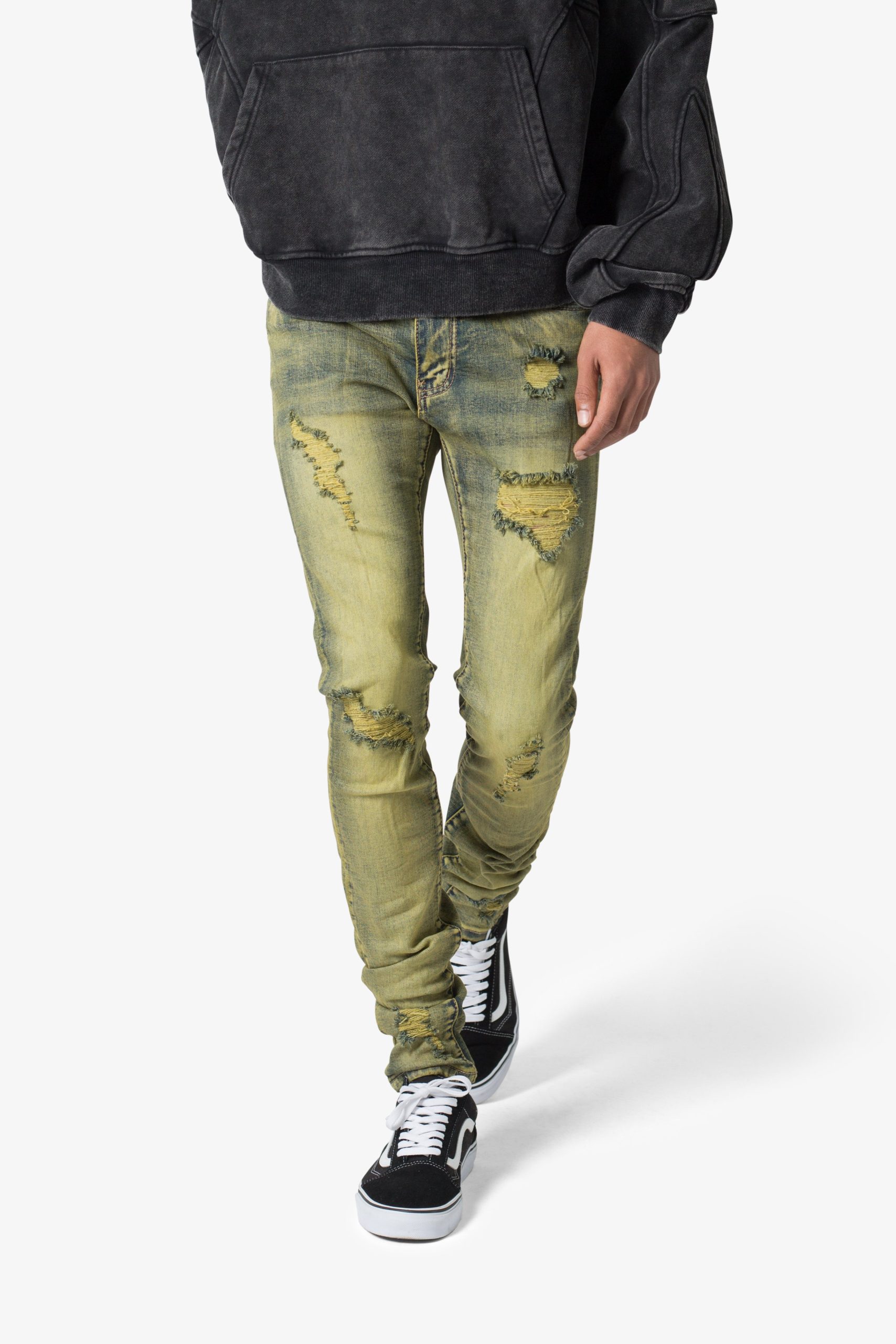 the X609 Algae Skinny Denim is designed with our X fit. which is skinny throughout with an extended inseam for stacking. and features a vintage blue wash with a green tint. and finished with distressing details.