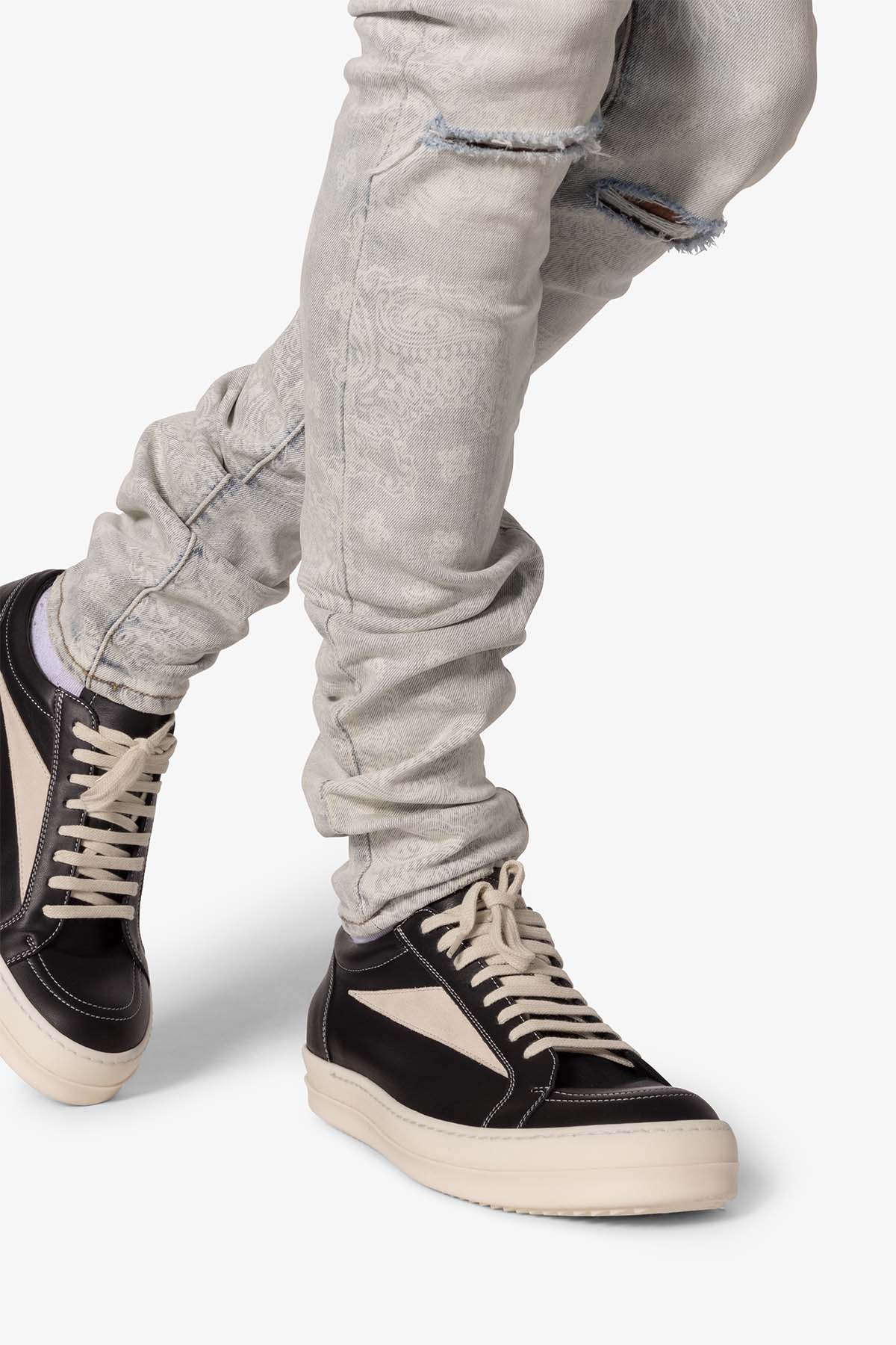 the X696 Paisley Patterned Denim is designed with our X fit which is skinny throughout with an extended inseam for stacking. is constructed from a stretch denim with a vintage wash. and is finished with a lasered paisley pattern throughout.