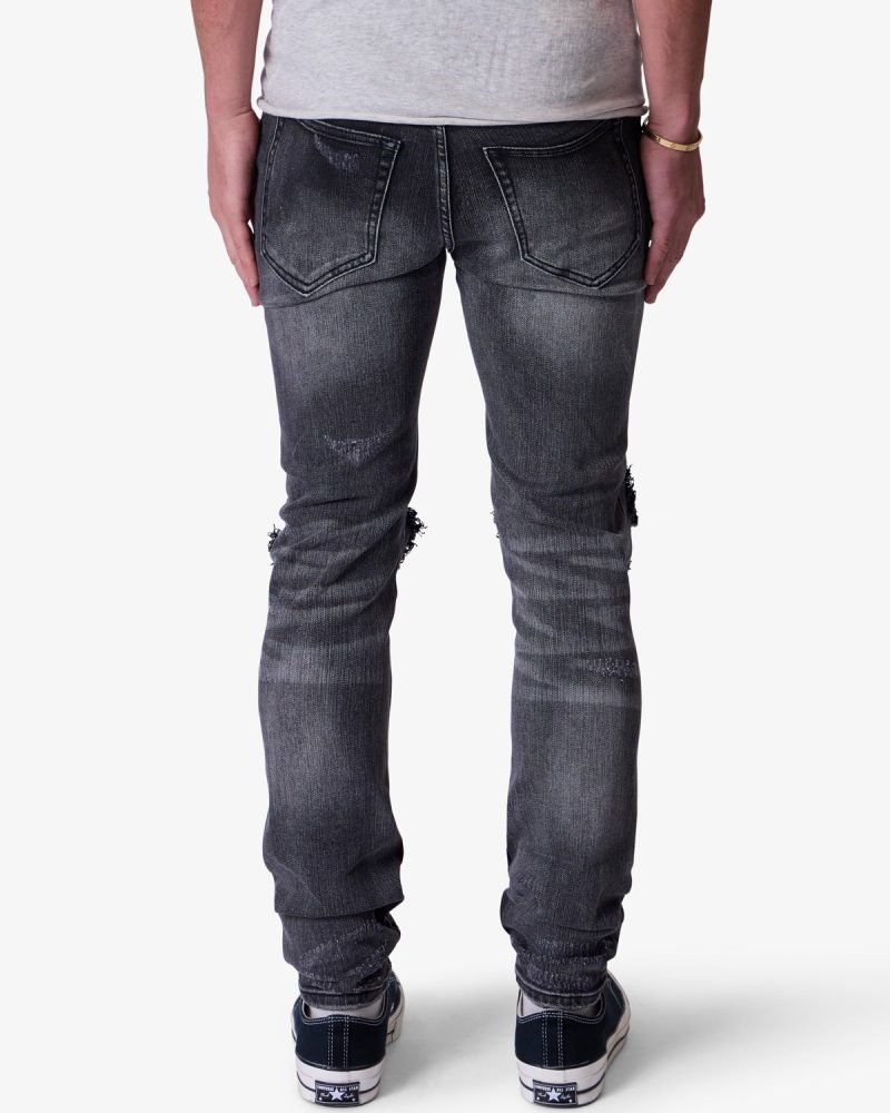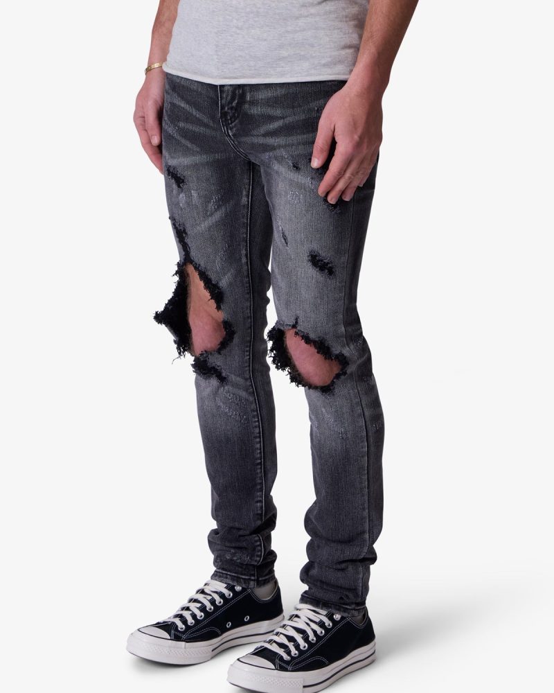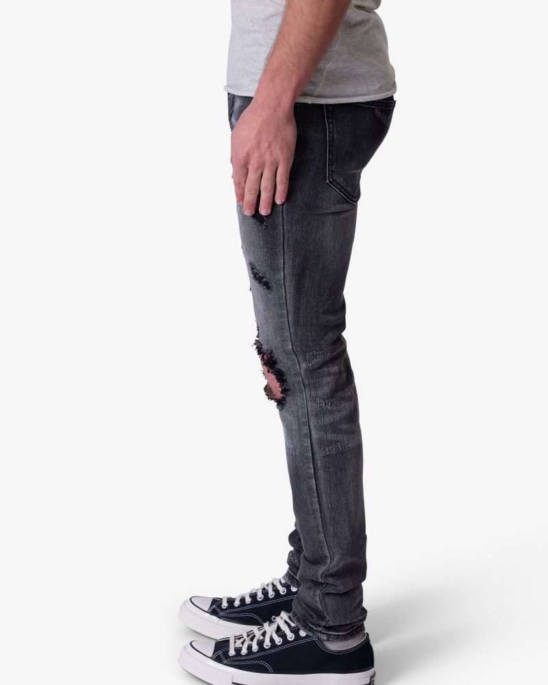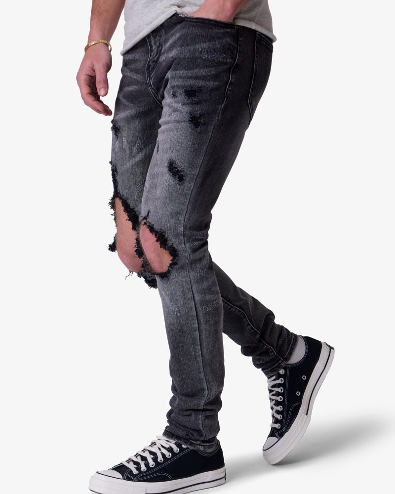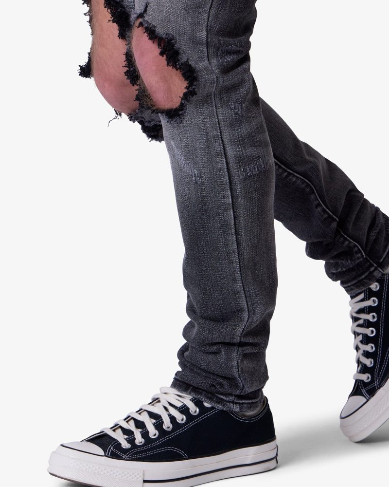 the X738 Chewed Up Denim is designed with our new X fit which is skinny throughout with an extended inseam for stacking. and features a vintage black wash and distressing at the knees and thighs.