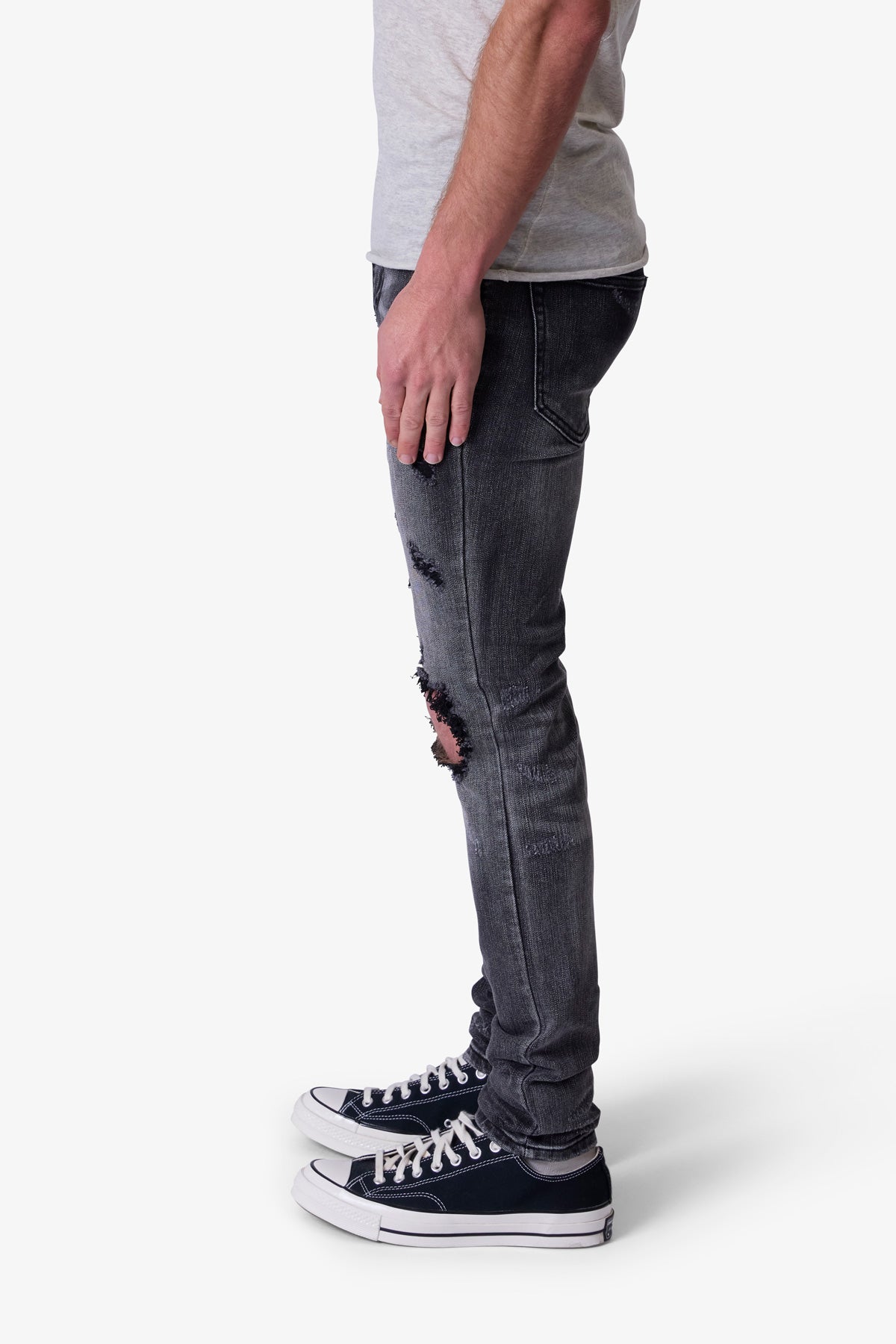 the X738 Chewed Up Denim is designed with our new X fit which is skinny throughout with an extended inseam for stacking. and features a vintage black wash and distressing at the knees and thighs.
